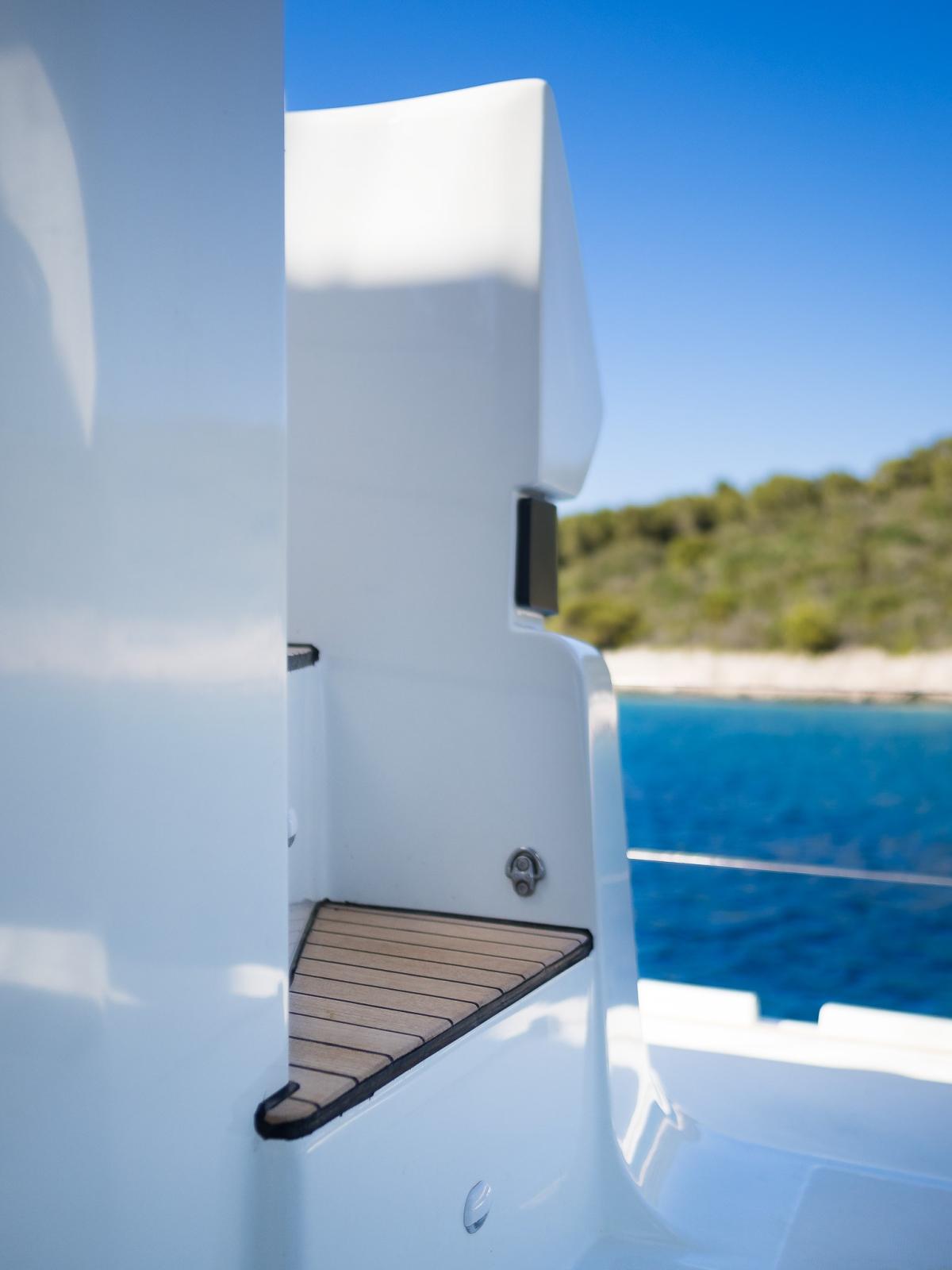 Sul ponte si può godere di un ampio flybridge con vista panoramica, ideale per navigare insieme o semplicemente rilassarsi al sole. L'ampio ponte di poppa scorre dolcemente nel salone, in modo che l'interno e l'esterno fluiscano senza soluzione di continuità l'uno nell'altro. All'interno, troverai un arredamento luminoso e moderno con ampie finestre, una cucina completamente attrezzata e comode cabine con bagno privato.