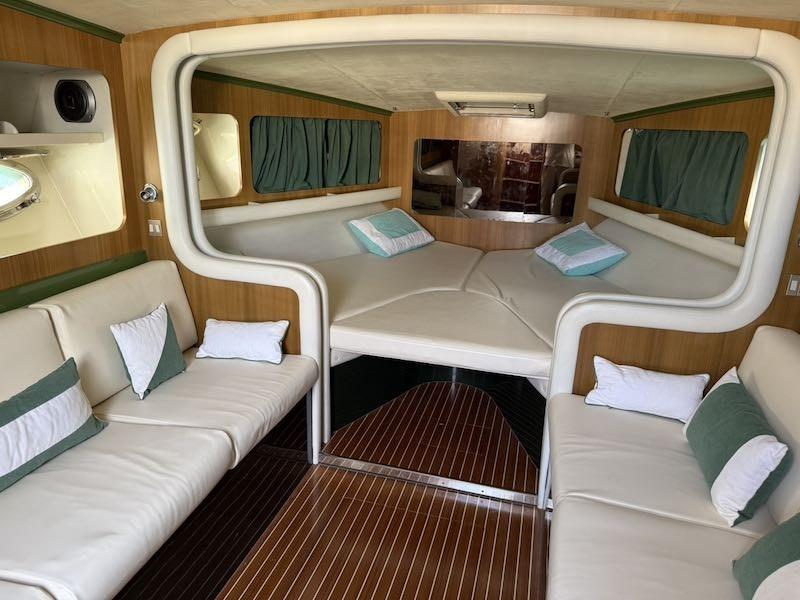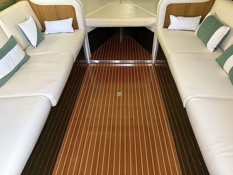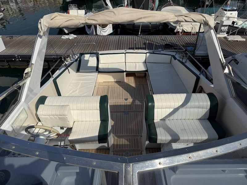Coperta: ampio pozzetto prendisole di poppa, postazione di pilotaggio a dritta e sedile passeggeri a sinistra. Prendisole di prua.