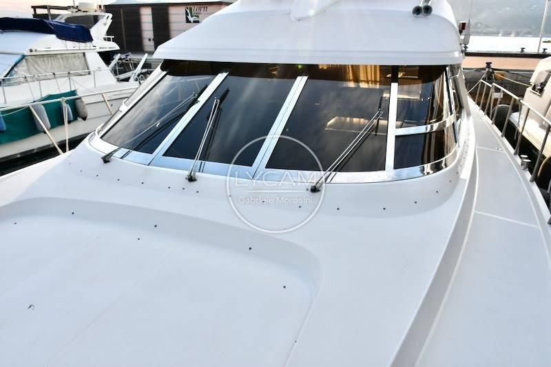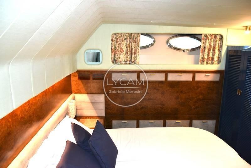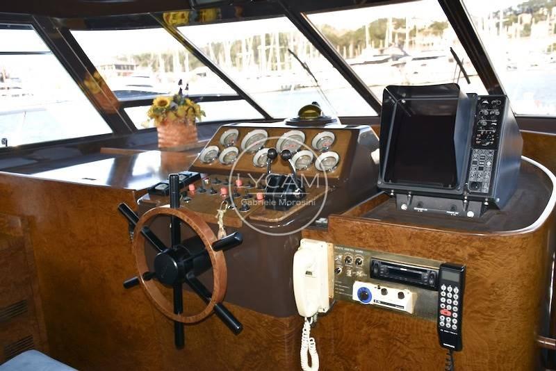 Doppia stazione di comando - fly e interno - con strumentazione motori originale, angolo barra, bussole 2, contamiglia, radar Furuno, VHF, autoradio con altoparlanti salone ,pozzetto e fly, autoradio in ogni camera, faro navigazione notturna con controllo doppio, antenna tv.