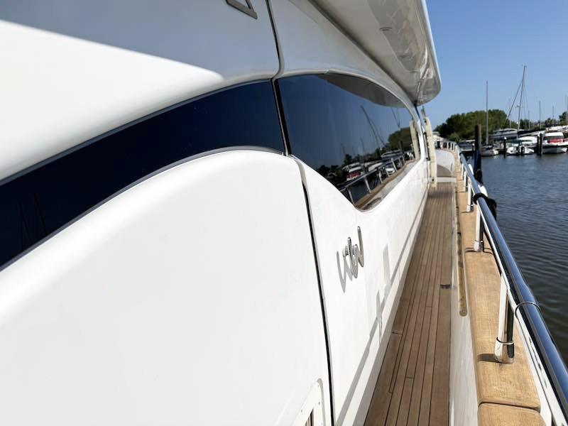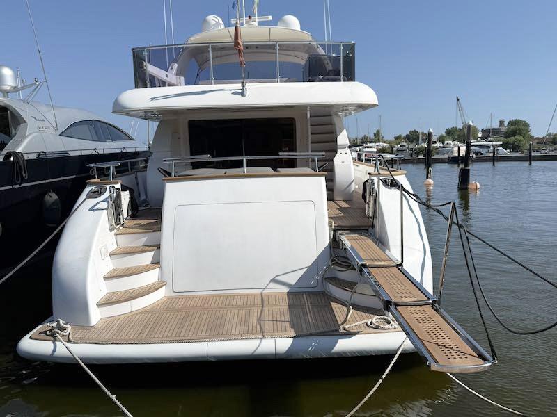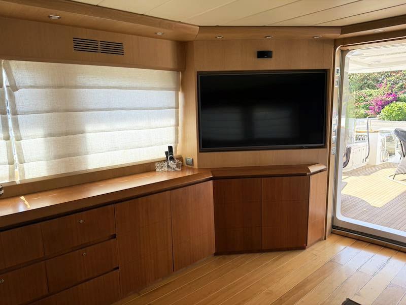 Luci di navigazione; Luce di fonda; Ancore; Catene inox 100 m; Passerella idraulica; Plancetta in teak; Teak in pozzetto; Doccia pozzetto (nuova); Scaletta bagno elettrica; Winch tonneggio; Tergicristalli; Presa 220V; Tavolo pozzetto; Verricelli salpancore elettrici; Tender gonfiabile garage di prua; Ice maker; Frigo esterno; Lavello fly; Piastra fuochi fly; Zattera salvataggio autogonfiabile; Elica di prua; Elica di poppa; Frigo interno; Forno; Piastra fuochi; Lavello cucina; Cuscinerie prendisole prua e fly; Impianto TV SAT; Altoparlanti; Cantina vini; Lavatrice; Asciugatrice; Aria condizionata; 2 Generatori Onan 27 Kw; 2 Dissalatori (2024) mod. Idromar 200 l/h; Batterie; Stacca-batterie; Caricabatterie servizi (nuovo); Pompe di sentina manuali; Pompa di sentina automatica (revisionata); Boiler; Autoclave (nuova); Centralina demotica; Serbatoio acque nere; Serbatoio acque grigie; Blowers; Asta bandiera