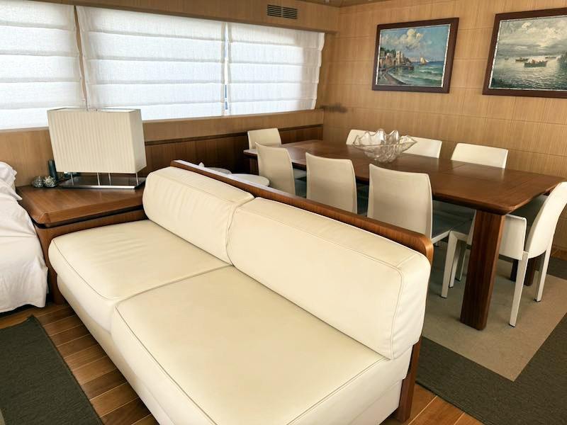 Il ponte di coperta, partendo dalla zona poppiera è composto da: pozzetto con divano e tavolo esterno mentre internamente si trova la spaziosa e luminosa dinette con zona salone attrezzata con divano a C e zona soggiorno con tavolo e sedute per 8 ospiti. Proseguendo verso prua vi è il locale cucina posto lungo la murata di sinistra e successivamente la zona timoneria interna.