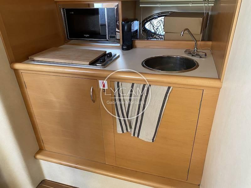 Sottocoperta lungo la murata di dritta è collocata la cucina mentre sul lato opposto la dinette. La cabina armatoriale con il suo bagno è collocata verso poppa mentre verso prua si trova quella VIP con il locale toilette annesso