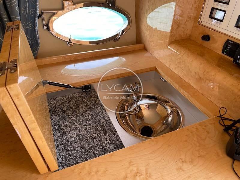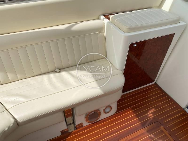 MOB (ile bar con frigo e ripiano seduta sulla murata di sinistra mentre sul lato opposto la plancia di comando con seduta di pilotaggio il cui schienale cela un elegante porta bicchieri. Nella zona prodiera del ponte di coperta è stato ricavato un ampio prendisole).