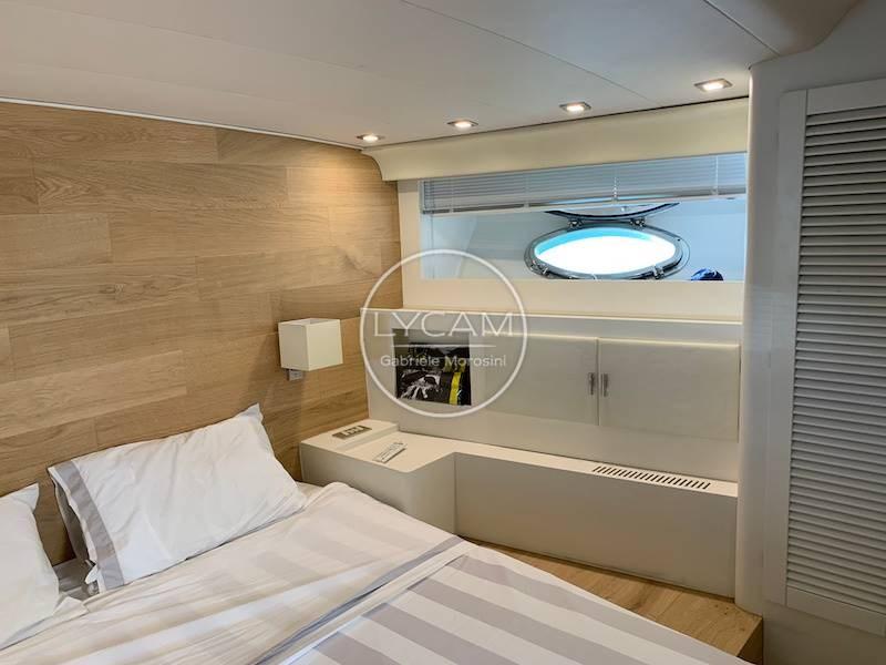 Gli interni ospitano sottocoperta la cucina a dritta e il corridoio che disimpegna un servizio , una cabina a letti piani a sinistra con bagno in suite, una cabina a letti sovrapposti a dritta e la cabina matrimoniale prua con il suo bagno. Cabina marinaio con accesso dalla coperta di prua, mentre a poppa con accesso dal pozzetto si trova un grande locale ad uso officina e magazzino.