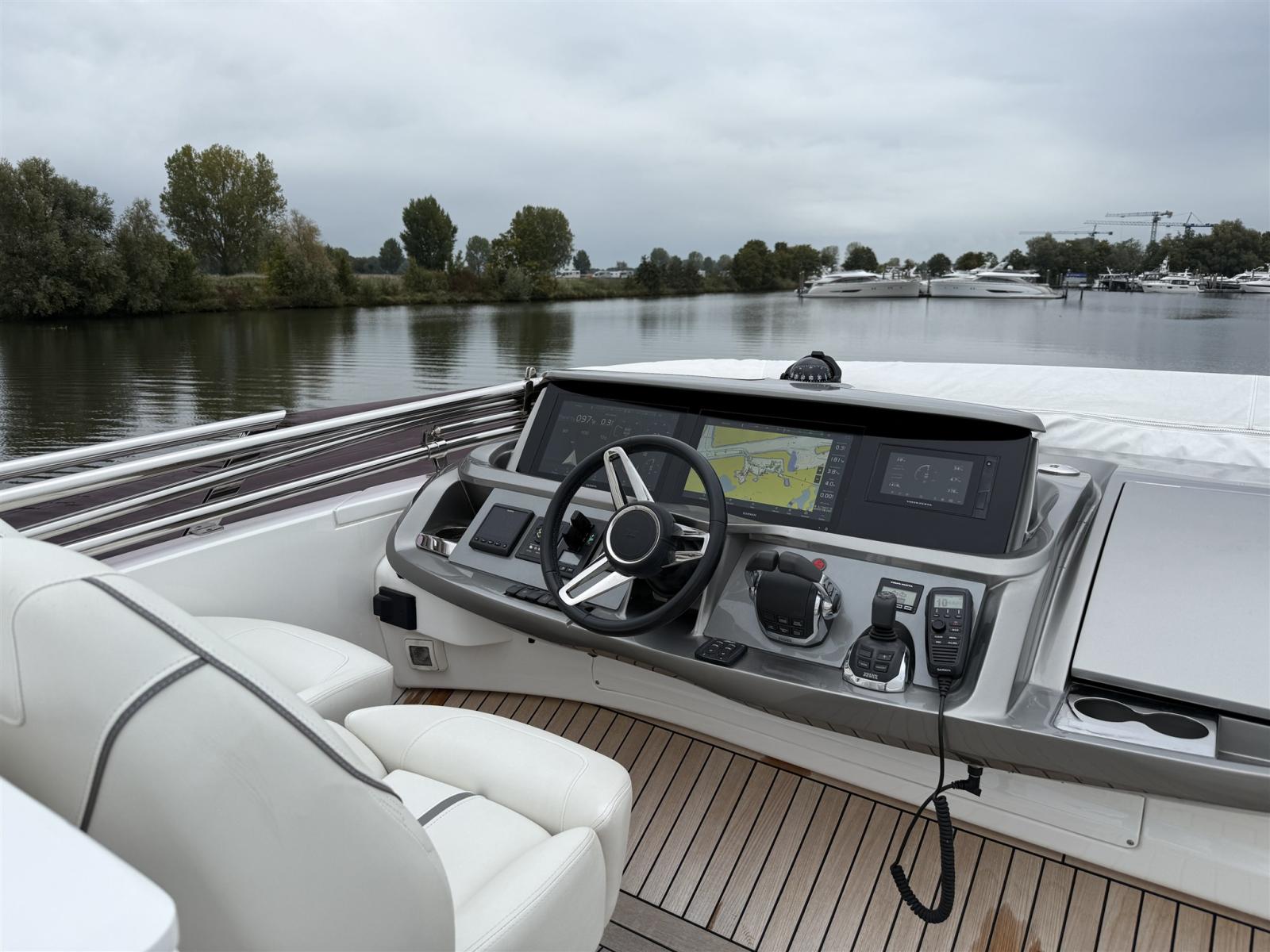 • Comando a joystick Volvo (doppia stazione) con manovra a bassa velocità in "docking mode" e sterzata a qualsiasi velocità in "driving mode". Aziona motori, timoneria e propulsore/i di poppa, compresa l'elica di poppa (elica di prua aggiornata a 210 KgF con velocità variabile)
