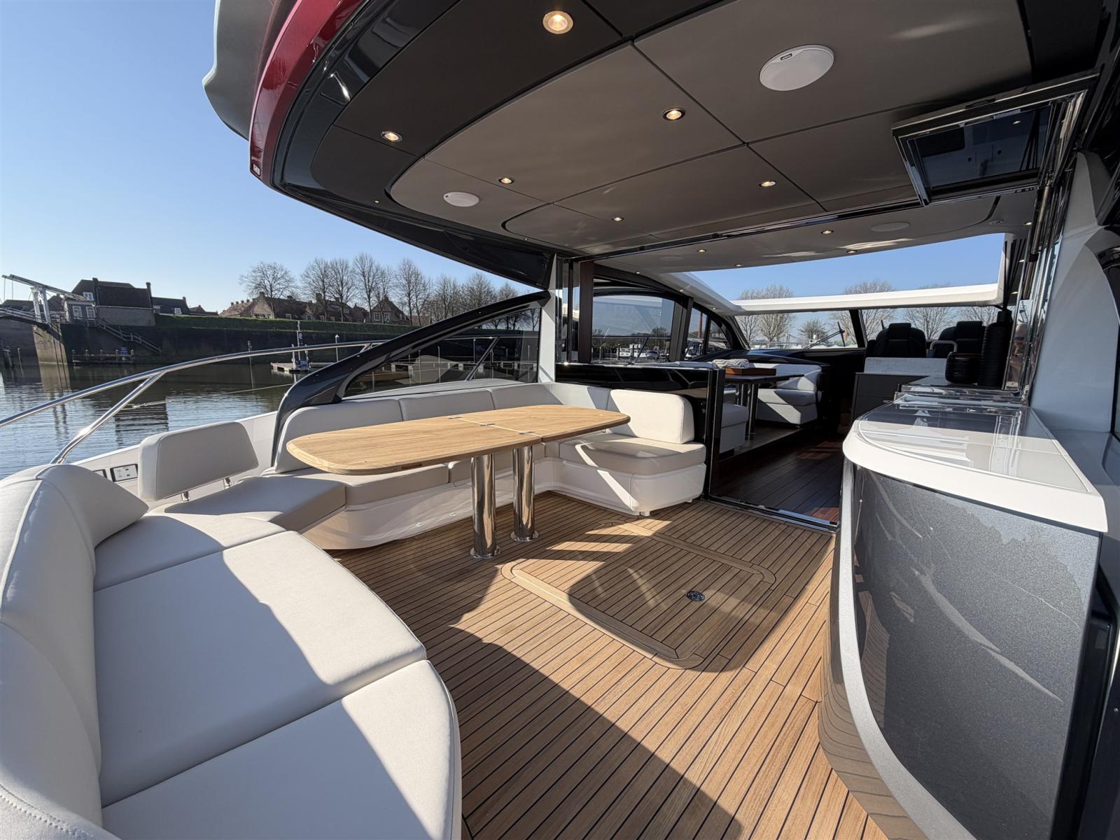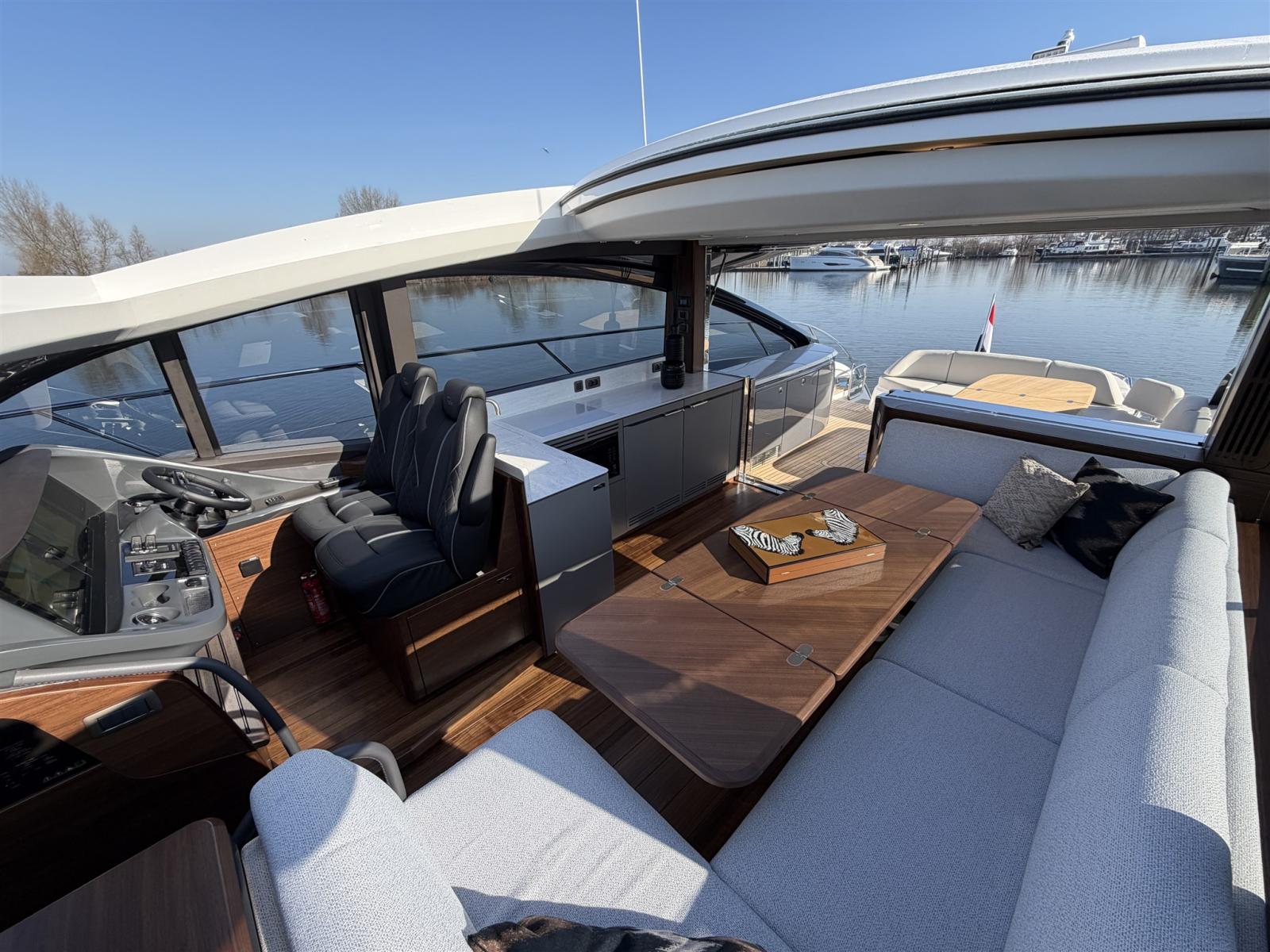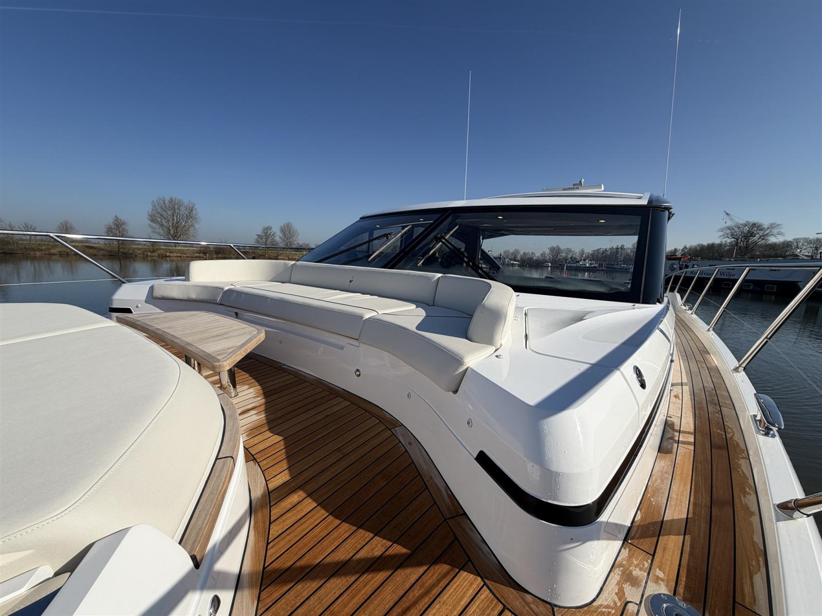 La gamma della Classe V si caratterizza per le sue linee chiare e fluide, accentuate dalle finestre panoramiche a forma di coltello che lasciano entrare la luce naturale e aprono l'interno al mondo circostante. Il profilo dinamico del V55 nasconde un interno spazioso, perfetto per rilassarsi o affrontare viaggi più lunghi con il massimo comfort. L'accesso all'interno avviene tramite la piattaforma idraulica per il bagno, che conduce a un ponte in teak che attraversa l'intera area abitativa. La cabina di pilotaggio si collega al salone principale tramite una porta scorrevole pieghevole abilmente nascosta, che integra perfettamente entrambi gli spazi abitativi. Inoltre, il tetto apribile elettricamente sopra il ponte principale ti permette di esporti davvero agli agenti atmosferici.