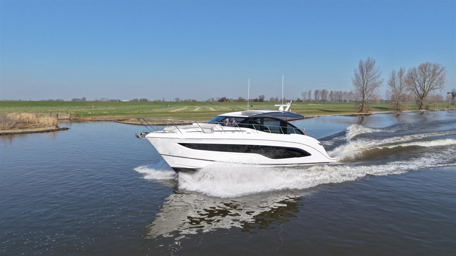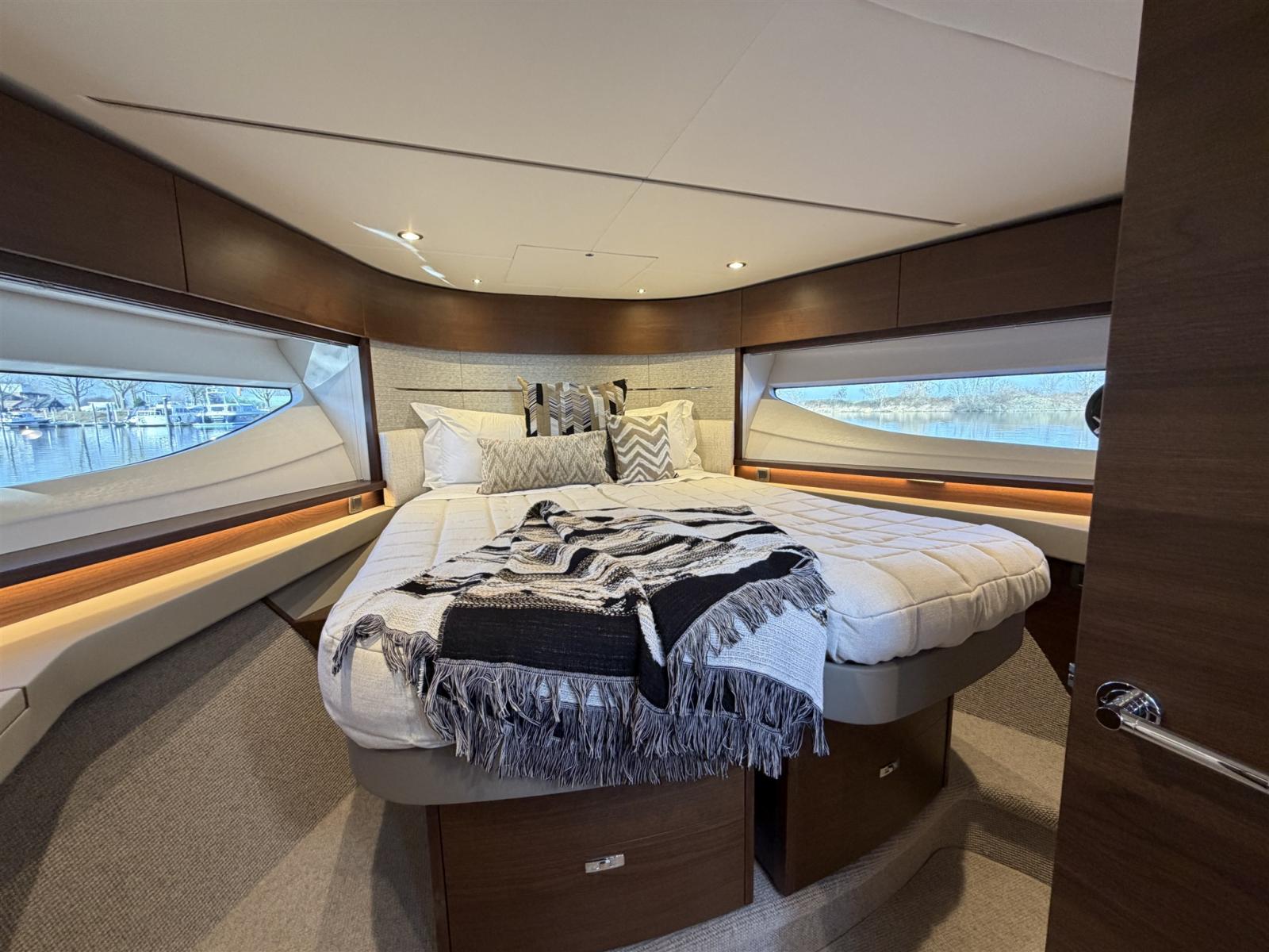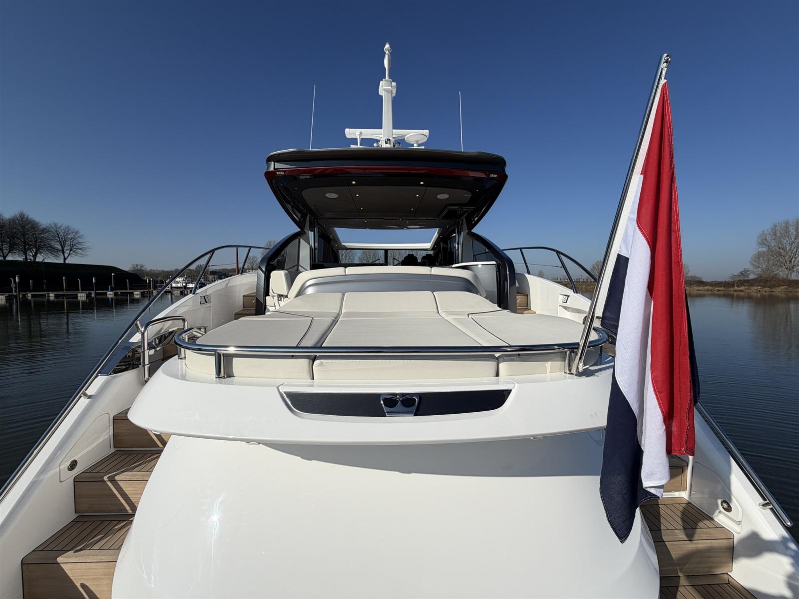 La gamma della Classe V si caratterizza per le sue linee chiare e fluide, accentuate dalle finestre panoramiche a forma di coltello che lasciano entrare la luce naturale e aprono l'interno al mondo circostante. Il profilo dinamico del V55 nasconde un interno spazioso, perfetto per rilassarsi o affrontare viaggi più lunghi con il massimo comfort. L'accesso all'interno avviene tramite la piattaforma idraulica per il bagno, che conduce a un ponte in teak che attraversa l'intera area abitativa. La cabina di pilotaggio si collega al salone principale tramite una porta scorrevole pieghevole abilmente nascosta, che integra perfettamente entrambi gli spazi abitativi. Inoltre, il tetto apribile elettricamente sopra il ponte principale ti permette di esporti davvero agli agenti atmosferici.