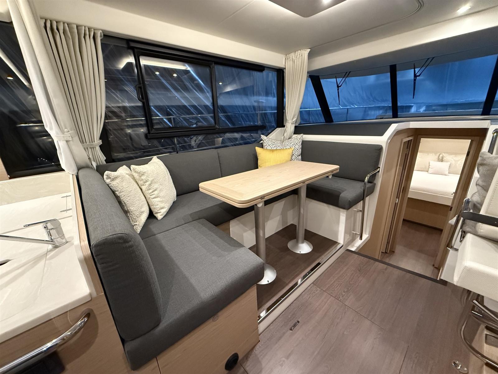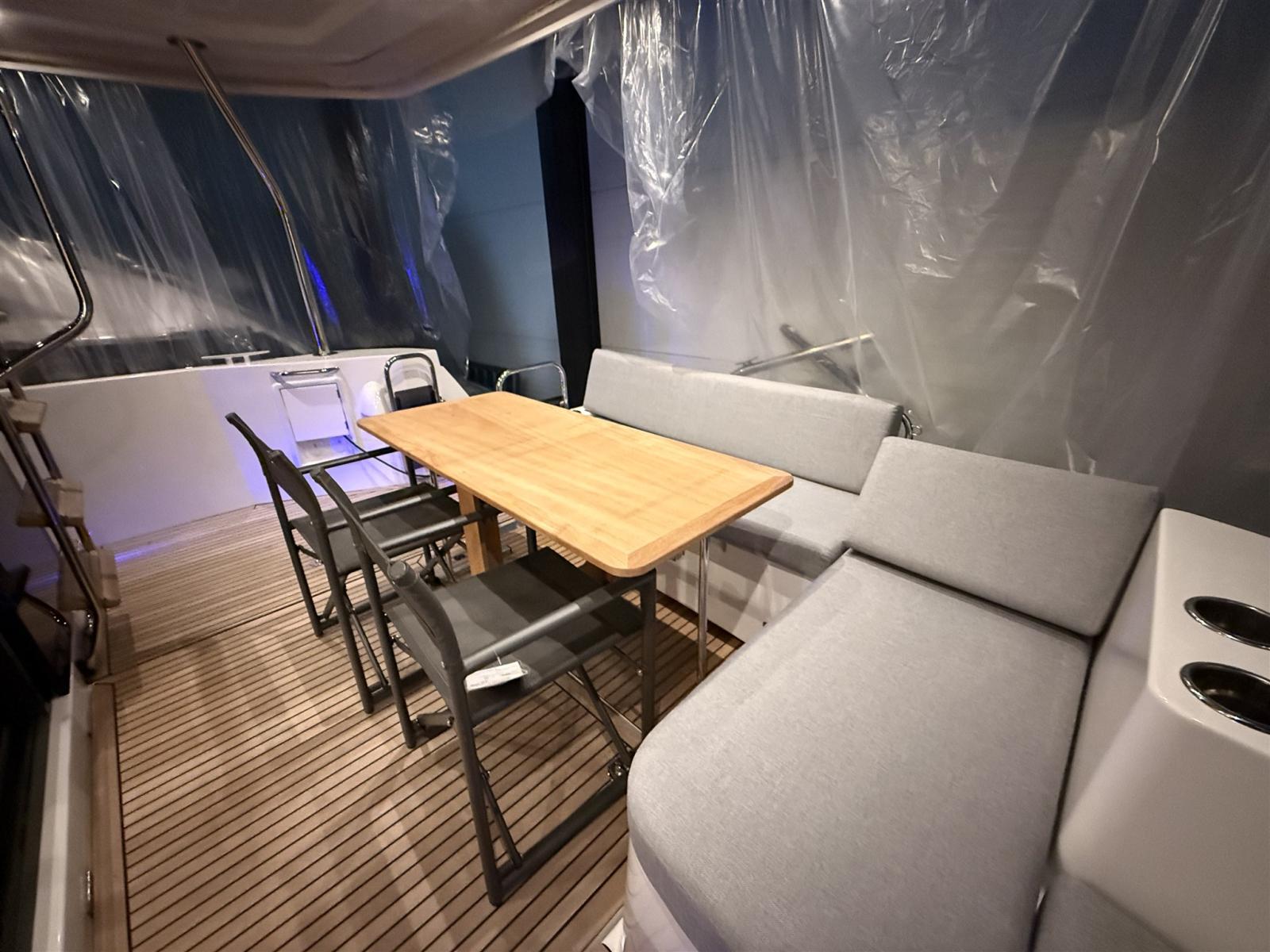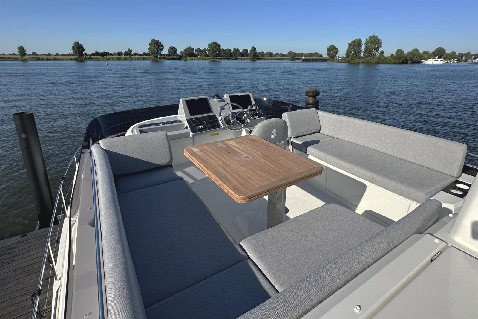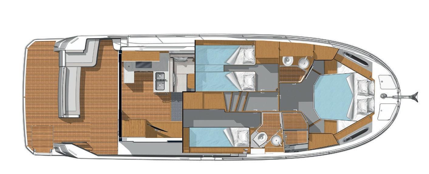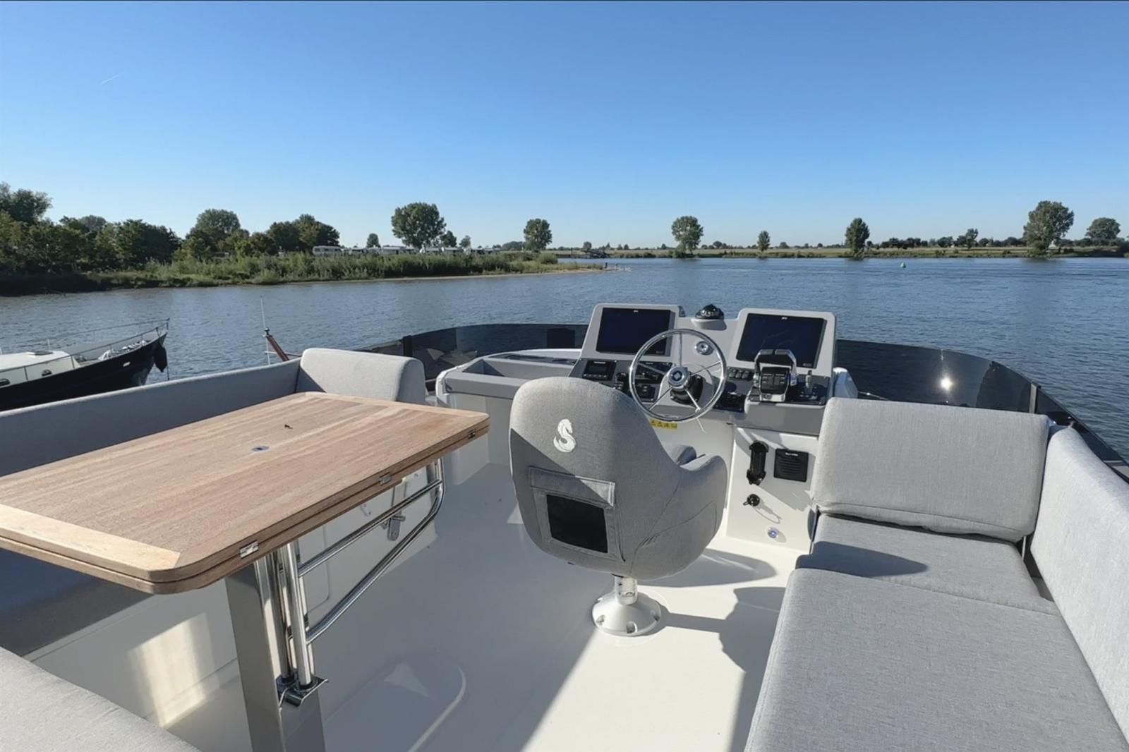 La disposizione elegante offre 3 cabine confortevoli con 2 bagni completi e un saloon che si trasforma in 2 cuccette extra in pochissimo tempo. Il flybridge è il più grande della sua categoria e offre un sedile spazioso e una seconda posizione di sterzata completa con una vista panoramica. Il largo, basso e asimmetrico passaggio, la generosa porta laterale in posizione di sterzo e la porta extra verso il molo rendono l'ormeggio facile e sicuro. La nave è molto riccamente equipaggiata e dispone delle seguenti opzioni, tra le altre: riscaldamento Webasto, propulsore a prua e poppa, plotter Raymarine, telecamera posteriore, radar, inverter.