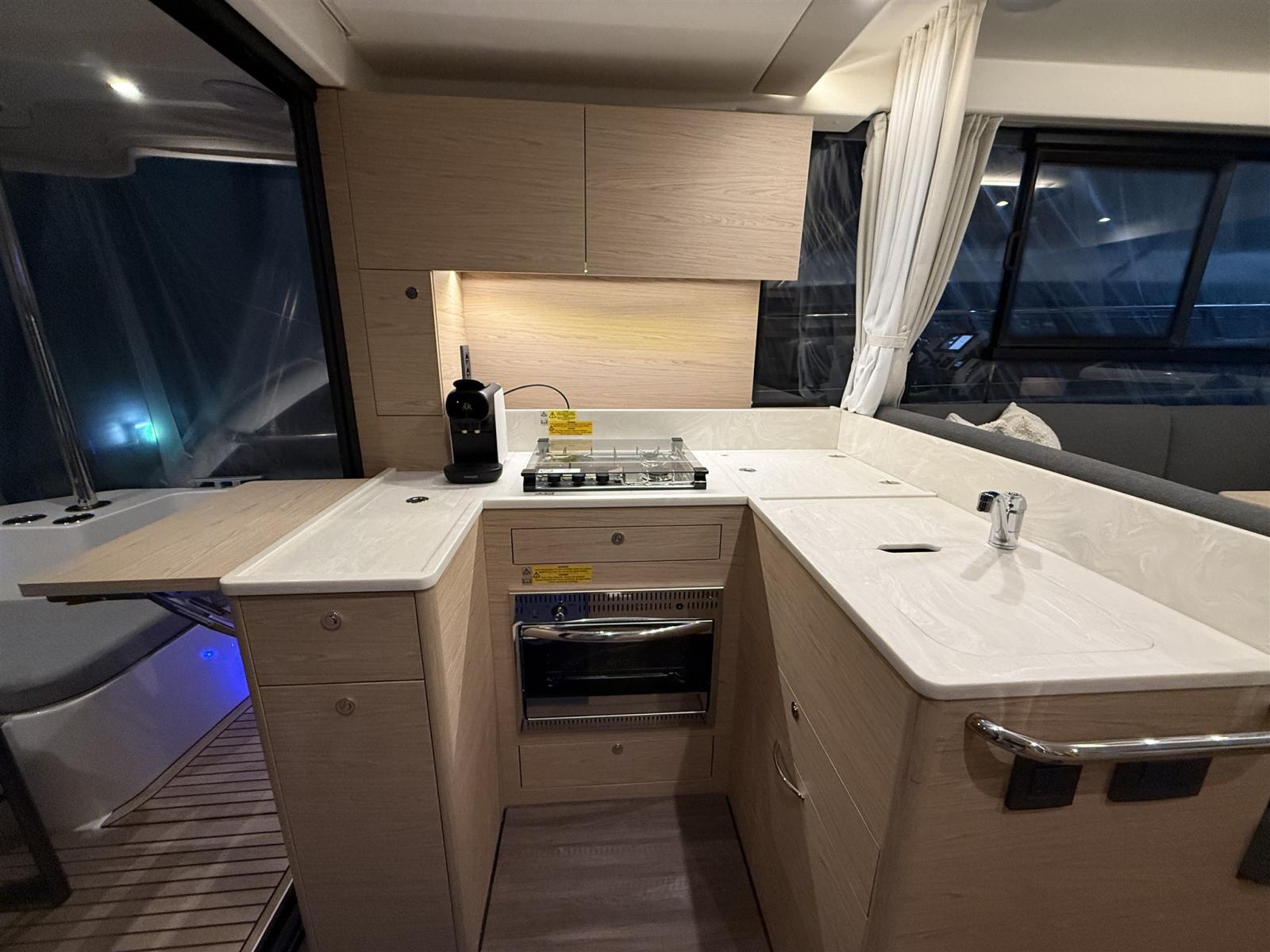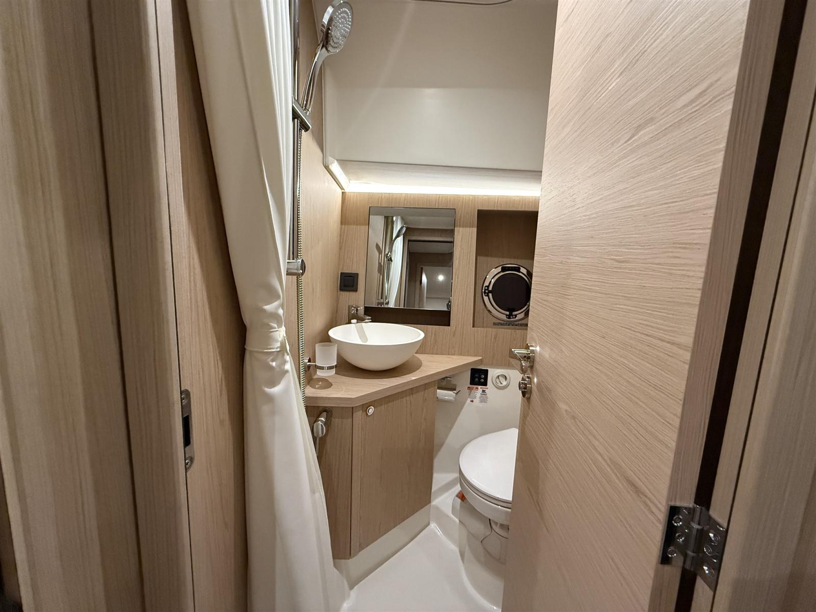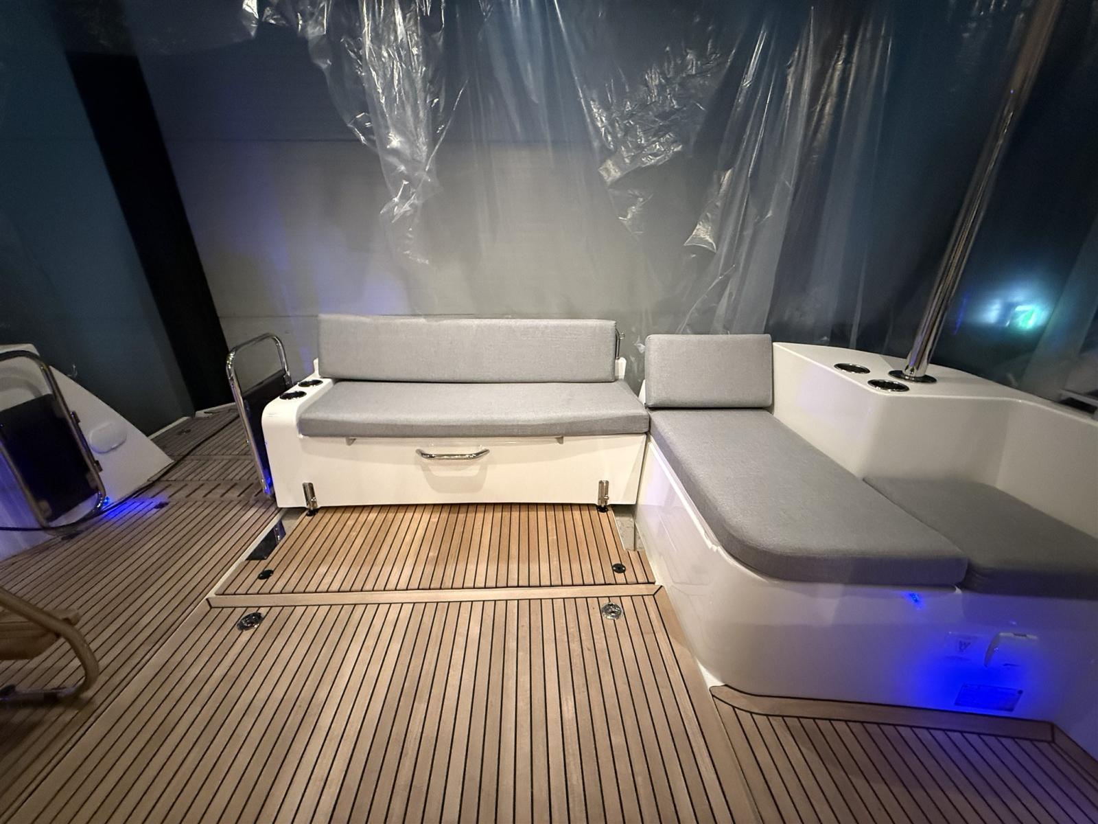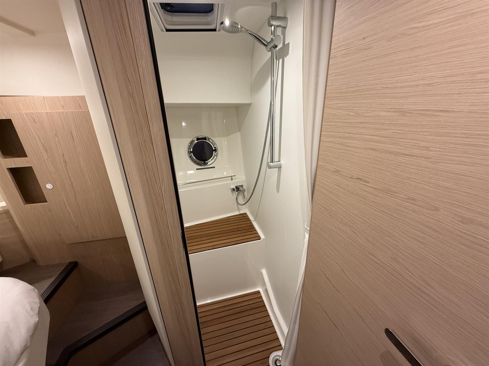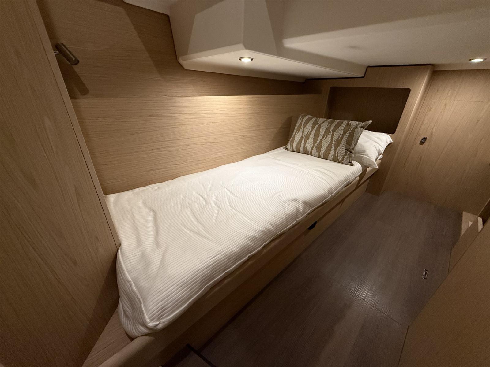 La disposizione elegante offre 3 cabine confortevoli con 2 bagni completi e un saloon che si trasforma in 2 cuccette extra in pochissimo tempo. Il flybridge è il più grande della sua categoria e offre un sedile spazioso e una seconda posizione di sterzata completa con una vista panoramica. Il largo, basso e asimmetrico passaggio, la generosa porta laterale in posizione di sterzo e la porta extra verso il molo rendono l'ormeggio facile e sicuro. La nave è molto riccamente equipaggiata e dispone delle seguenti opzioni, tra le altre: riscaldamento Webasto, propulsore a prua e poppa, plotter Raymarine, telecamera posteriore, radar, inverter.