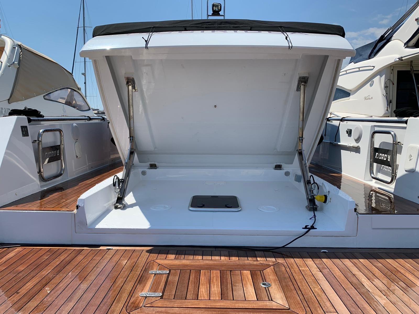 Allarme motore, Allarme sentina, Ancora (Lewmar Delta 10kg with 50 m stainless steel anchor chain and hydraulic system), Autoclave, Auto-Trim ((option) Volvo Interceptor), 6 Batterie (2x90Ah + 4x160Ah AGM), 6 Bitte Abbattibili, Bocche di Lupa, Camminamenti laterali in teak, Doccia esterna, Flap elettrici (Volvo Penta BTS (boat trim system)), Garage per tender (with hydraulic opening), Impianto antincendio (Fire buoy), Indicatori Flaps, Luci di cortesia ((option)), 4 Luci subacquee, Passerella ((option) Hydraulic), Piattaforma (Hydraulic tender lift), 2 Pompa di sentina automatica, Porta ingresso (sliding), Pozzetto Teak, Presa 220V banchina ((additional shorepower with AC)), Salpa Ancore Elettrico, Scaletta da bagno, 2 Tavolo pozzetto, 2 Tientibene con cancelletti, Tromba, T-Top.