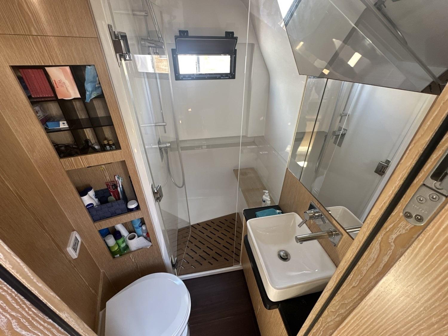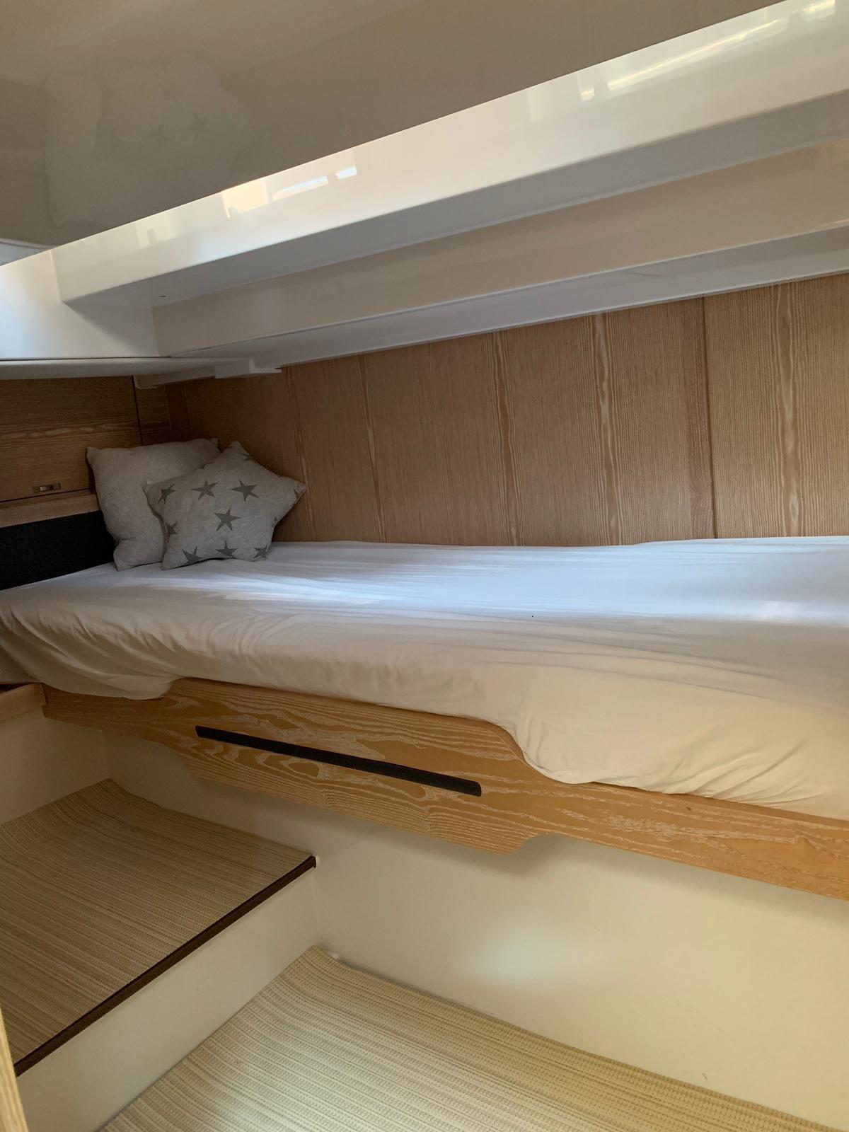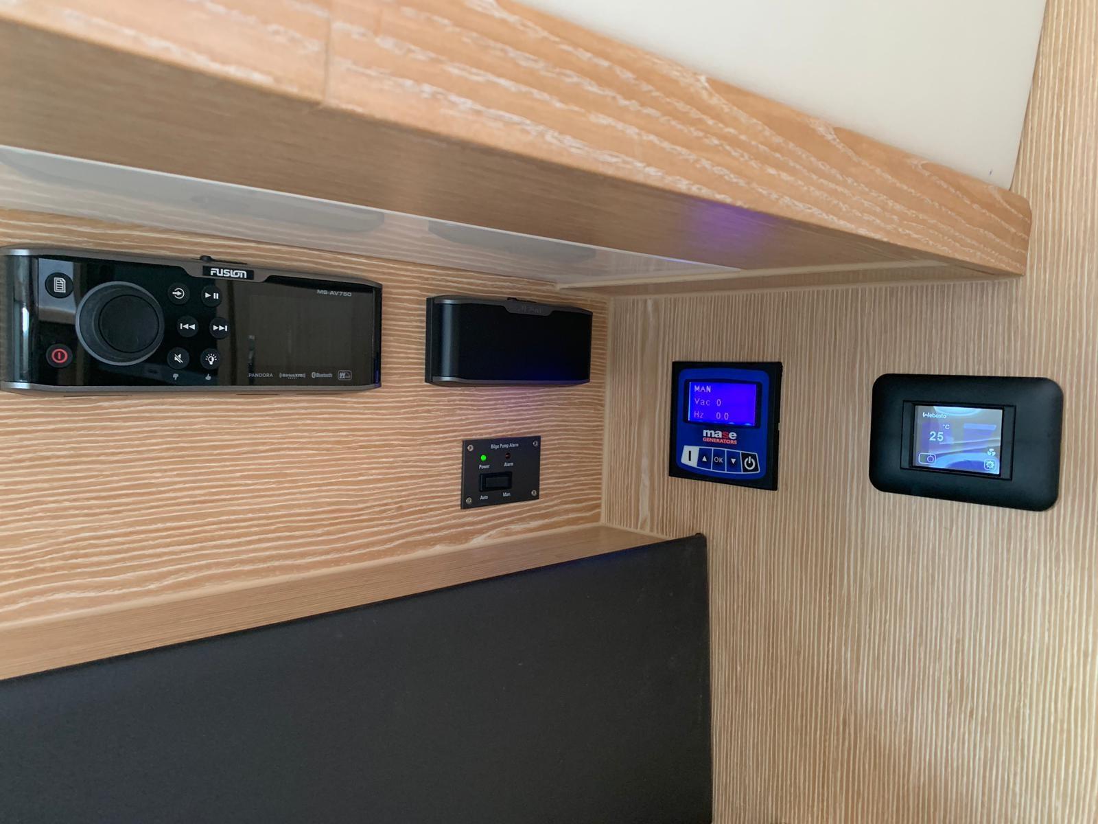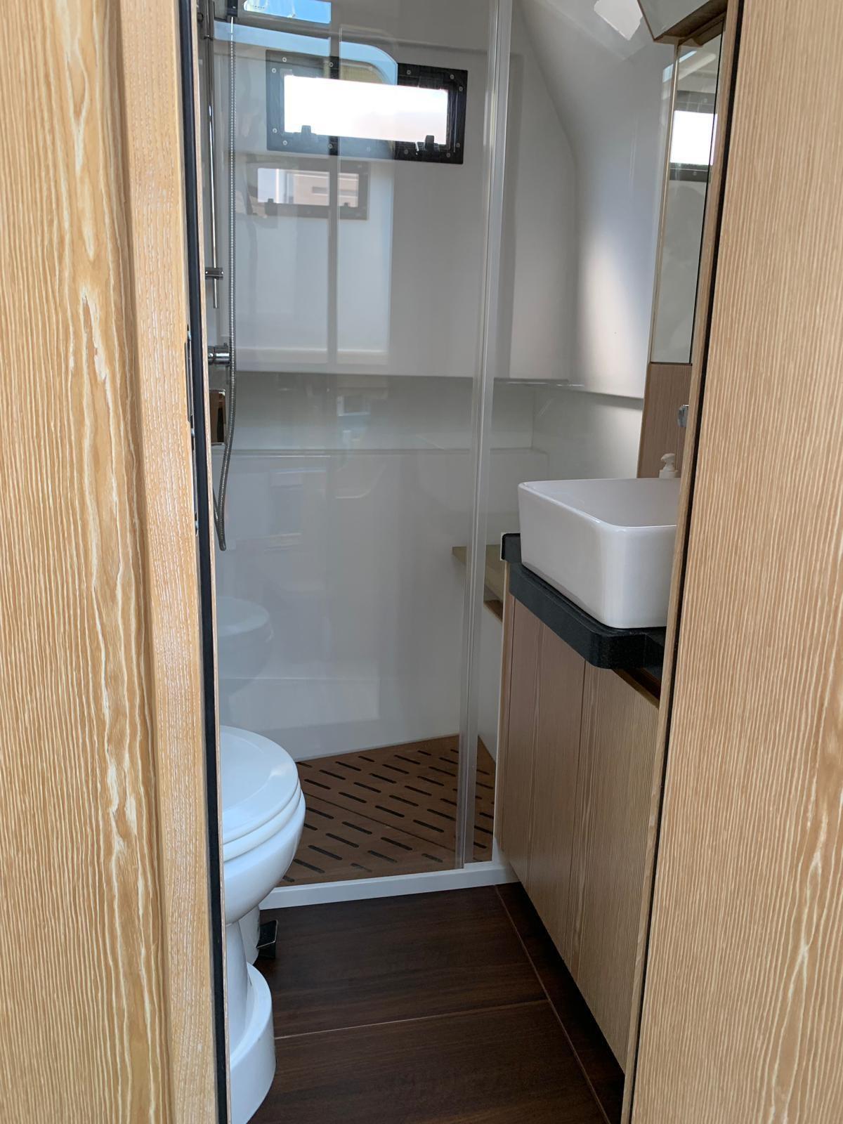 Aria condizionata ((option) 16.000 or 32.000 BTU), BBQ/ Grill, Boiler, Cassaforte, Inverter ((option) 3000W 150 Amps), Pavimento interno in legno, Prese interne 12v, Prese interne 220v, Serbatoio Acque Nere (60 litres), WC marino elettrico.