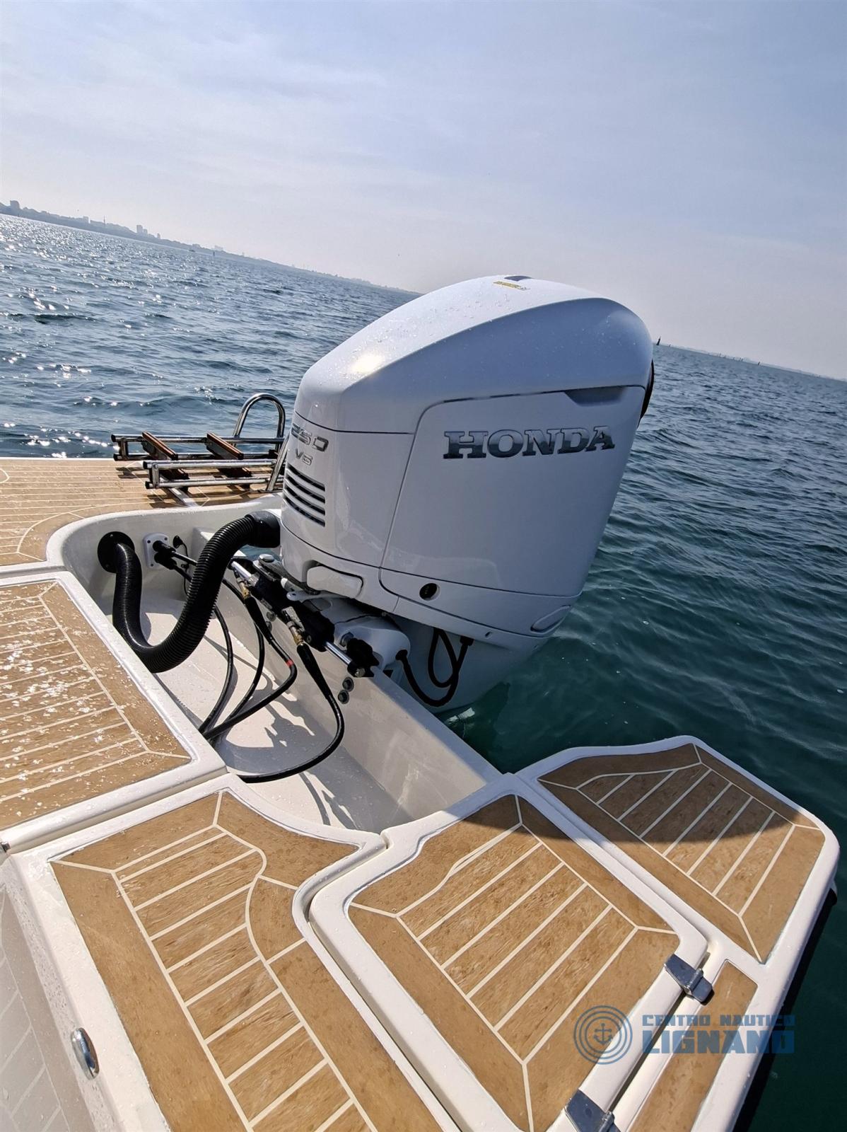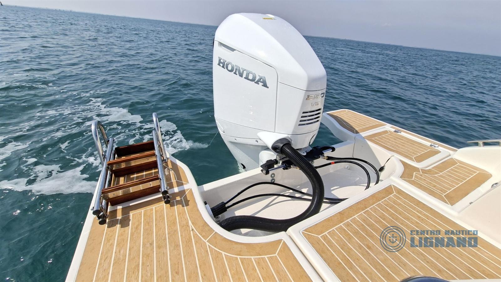 Compreso motore nuovo Honda Marine BF250 Total White modello 2026 con tiumoneria idraulica, impianto doppia batteria, stacabatterie, computer Honda Marine, elica inox, chiesuola elettronica modello 2026.