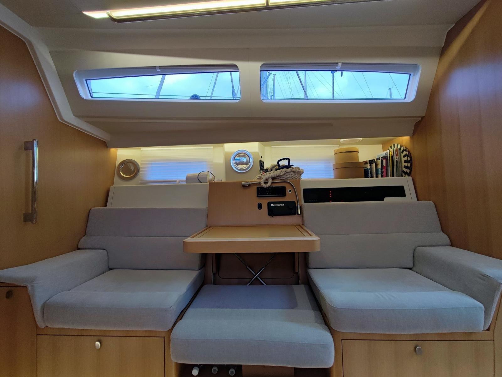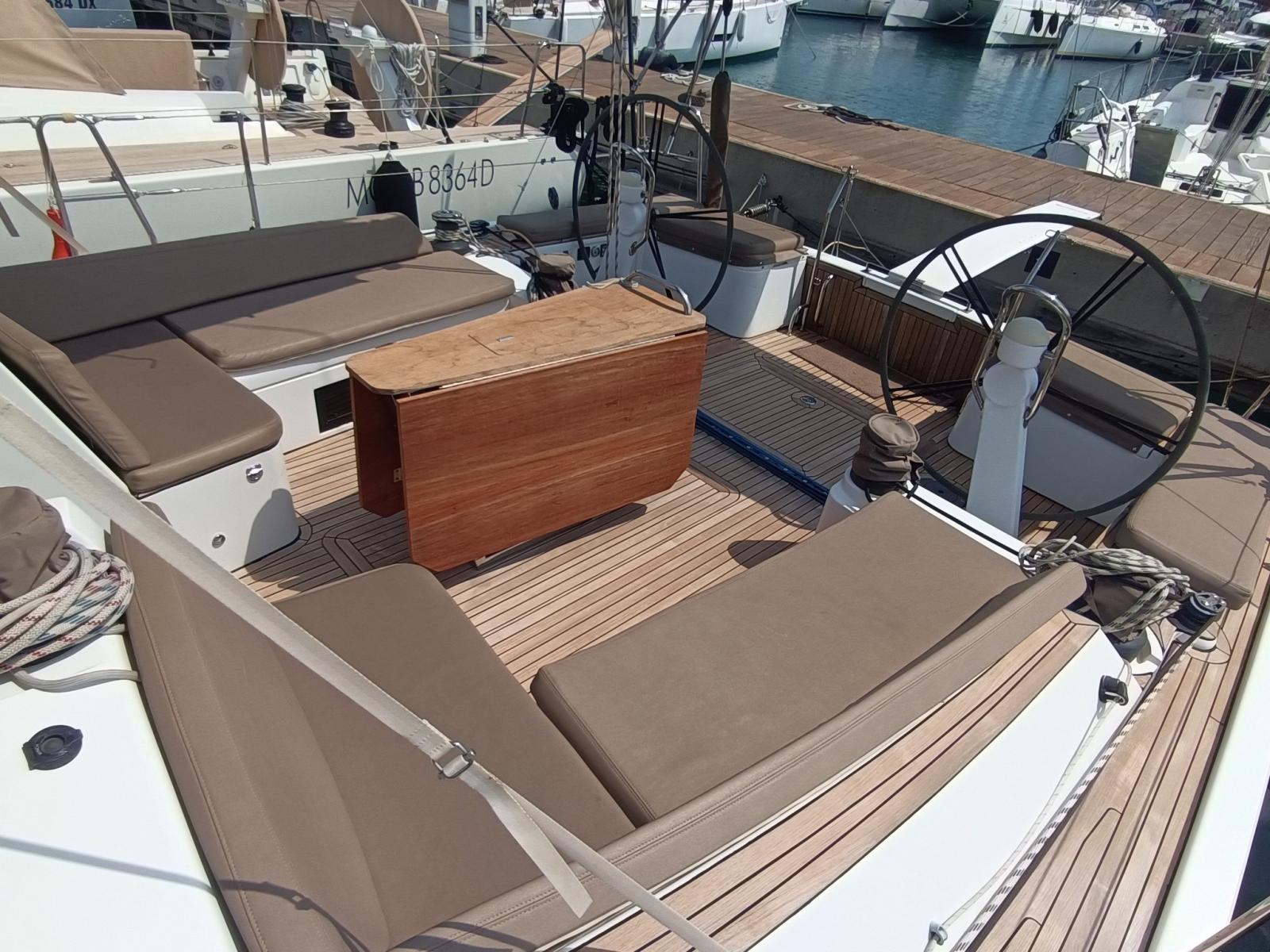 Accessoriata con: randa full-batten, fiocco del 2021, code 0 con avvolgitore Ubi-Major, bompresso in carbonio, elica di prua, piattaforma di poppa abbattibile elettricamente, riscaldamento Webasto, inverter, sei winch di cui 1 elettrico, sprayhood e lazy bag del 2025, bimini, panche del pozzetto trasformabili in prendisole ed elettronica Raymarine completa di pilota automatico.