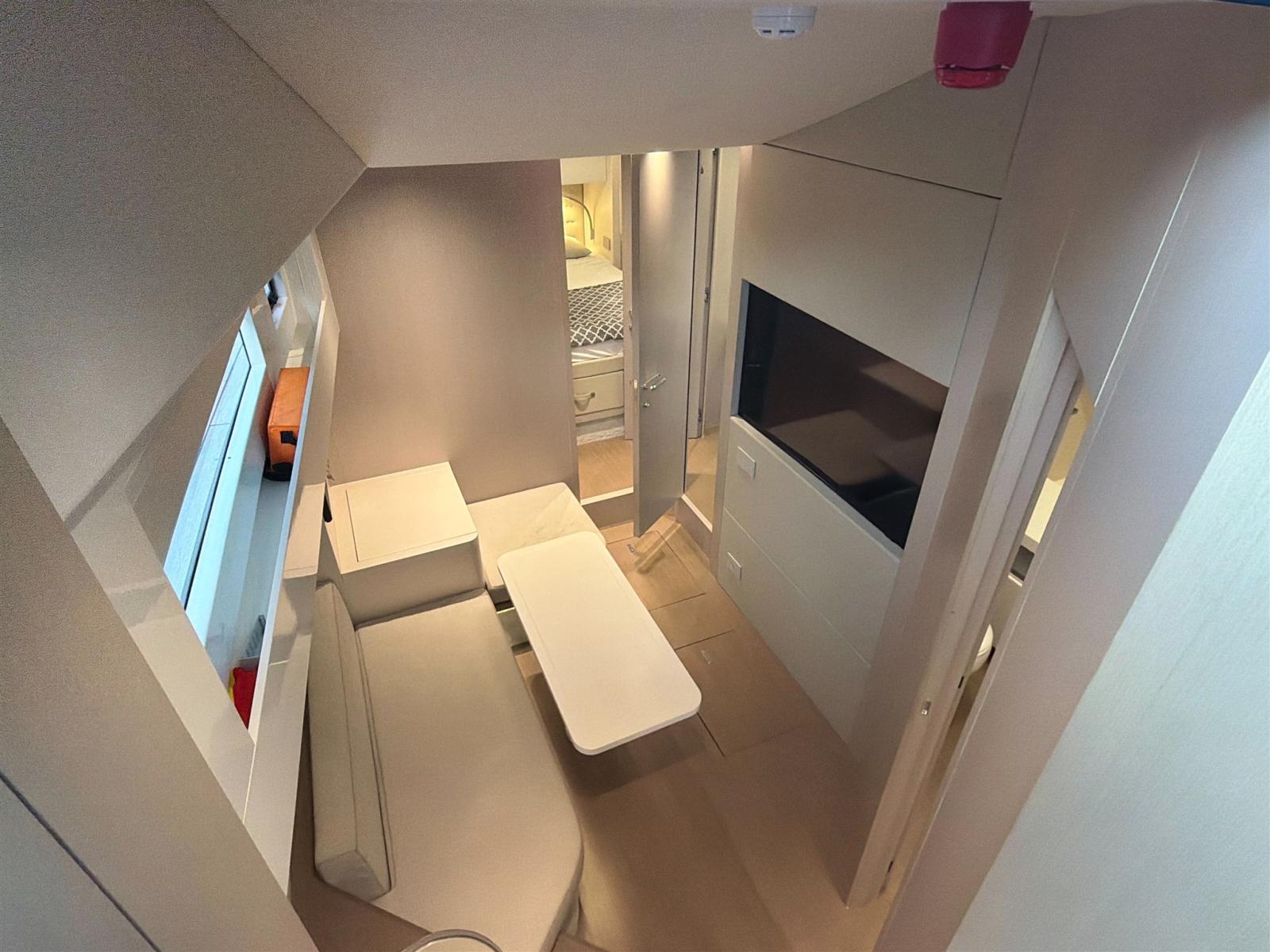 DINETTE CON DIVANO, 2 CABINE MATRIMONIALI CON BAGNO IN SUITE, BAGNI CON WC, LAVELLO E BOX DOCCIA - POSTAZIONE CUCINA ESTERNA CON AMPIO PIANO DI LAVORO, FORNO COMBINATO BOSCH, ICE MAKER, LAVELLO E DOPPIO FRIGORIFERO DA 90 LT.