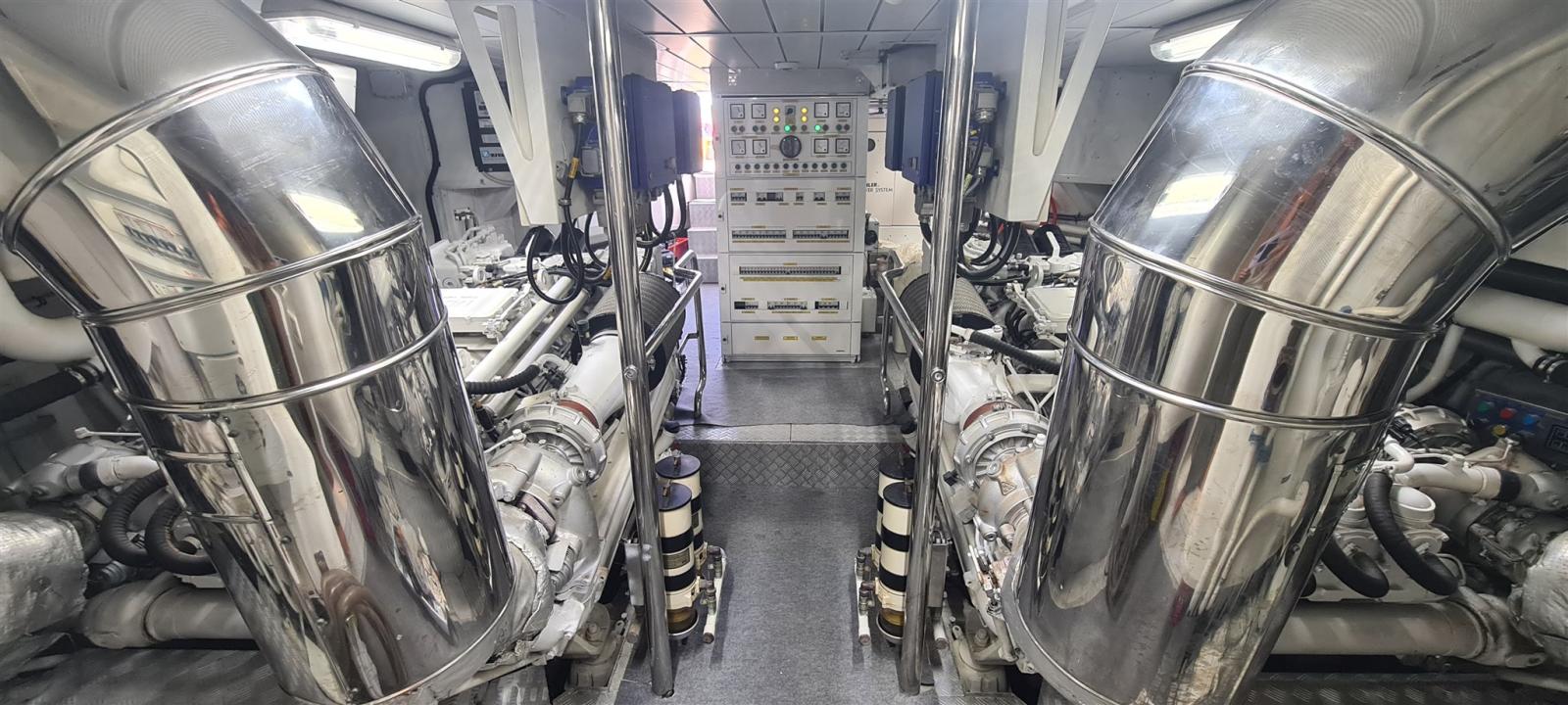 Allarme fumo/gas, Allarme motore, Allarme sentina, Ancora (con 100 m di catena da14), 2 Autoclave, 12 Batterie, Camminamenti laterali in teak, 2 Caricabatterie, Cavo corrente di banchina, Doccia esterna, Doppia timoneria, Elica di poppa - stern thruster (elettrica), Elica di prua - bow thruster (idraulica), Fari fissi a poppa, Faro orientabile, 2 Flap elettrici, 2 Garage per tender, Gruette per tender su fly (Opacmare), Impianto antincendio, Indicatori Flaps, Lavaggio catena, Luci di cortesia, Monitor batteria, Parabordi, Passerella (IDRAULICA), Piattaforma, Pompa di sentina automatica, Ponte in teak, Porta ingresso, Pozzetto Teak, 2 Presa 220V banchina, Presa acqua banchina, Raddrizzatore, Rollbar, Salpa Ancore Elettrico (Lofrans), Scaletta da bagno, Selle per Tender, Tavolo pozzetto (allungabile fisso in teack), Tromba, 2 Winch tonneggio di poppa, Winch tonneggio di prua.