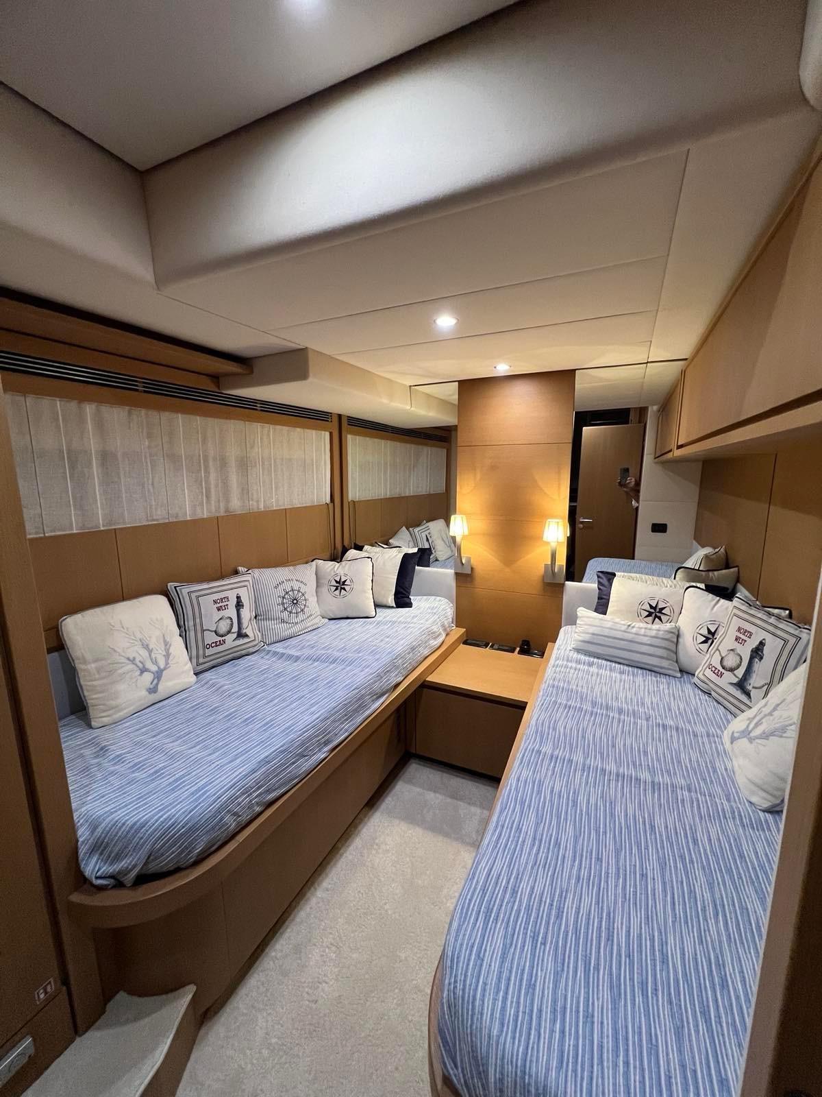 Allarme motore, Allarme sentina, 2 Autoclave, 14 Batterie (12 servizi+ 2 motori), Camminamenti laterali in teak, 4 Caricabatterie, Colorazione speciale, Doccia esterna, Faro orientabile, Flap idraulici, Hard top (sul Fly), Impianto antincendio, Impianto Aria Compressa, Indicatori Flaps, Lavaggio catena, Luci di cortesia, Luci subacquee, Passerella (Besenzoni a scomparsa), Piattaforma, Pompa di sentina automatica, 5 Pompa di sentina elettrica, Porta ingresso, Porta laterale, Pozzetto Teak, Presa 220V banchina, Presa acqua banchina, Ripetitore strumentazione, Salpa Ancore Elettrico, Scaletta da bagno, Tavolo pozzetto, Tender, Tromba, Tuga in teak, 2 Winch tonneggio di poppa.