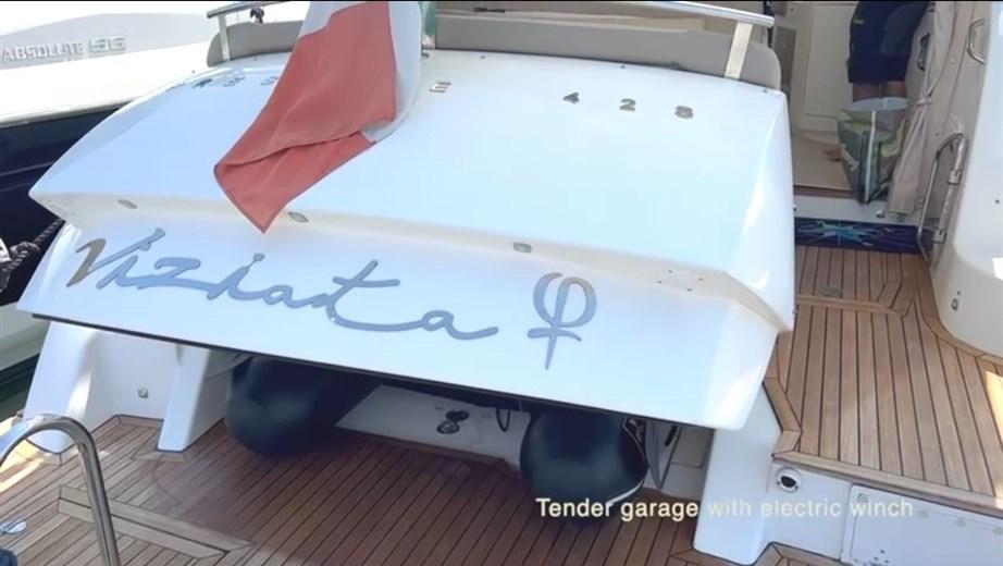 Allarme motore, Autoclave, 8 Batterie, Doccia esterna, Flap idraulici, Garage per tender, Hard top, Indicatori Flaps, Lavandino nel Pozzetto, Luci di cortesia, Luci subacquee, Passerella (a scomparsa Besenzoni), Piattaforma (in teack), Pompa di sentina automatica, Porta ingresso, Pozzetto Teak, Presa 220V banchina, Presa acqua banchina, Raddrizzatore, Salpa Ancore Elettrico, Scaletta da bagno, Tavolo pozzetto, Tavolo Salone Abbattibile, Tender, Tromba.