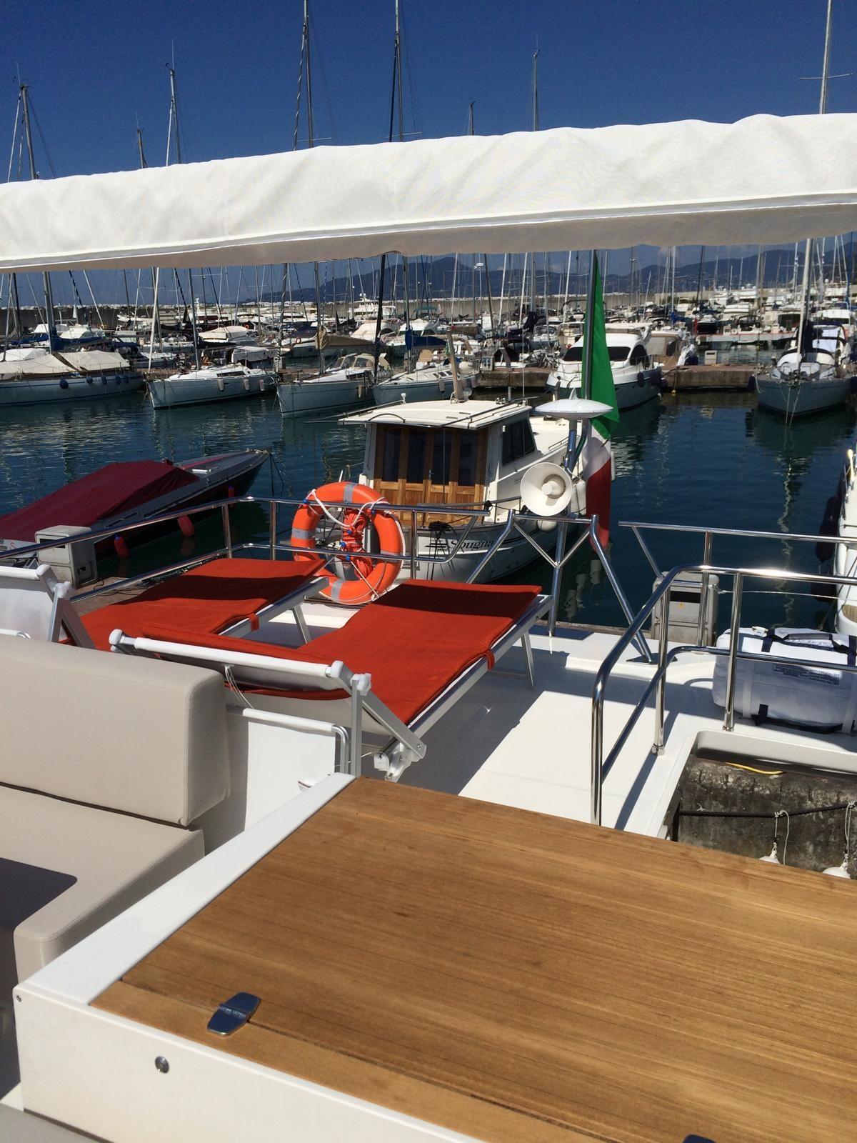 Allarme motore, Corrimano, Doccia esterna, Flap elettrici, Impianto antincendio, Luci di cortesia, Luci subacquee, Passerella, Pozzetto Teak, Presa 220V banchina, Presa acqua banchina, Salpa Ancore Elettrico, Scaletta da bagno, Selle per Tender, Tender, Tromba.
