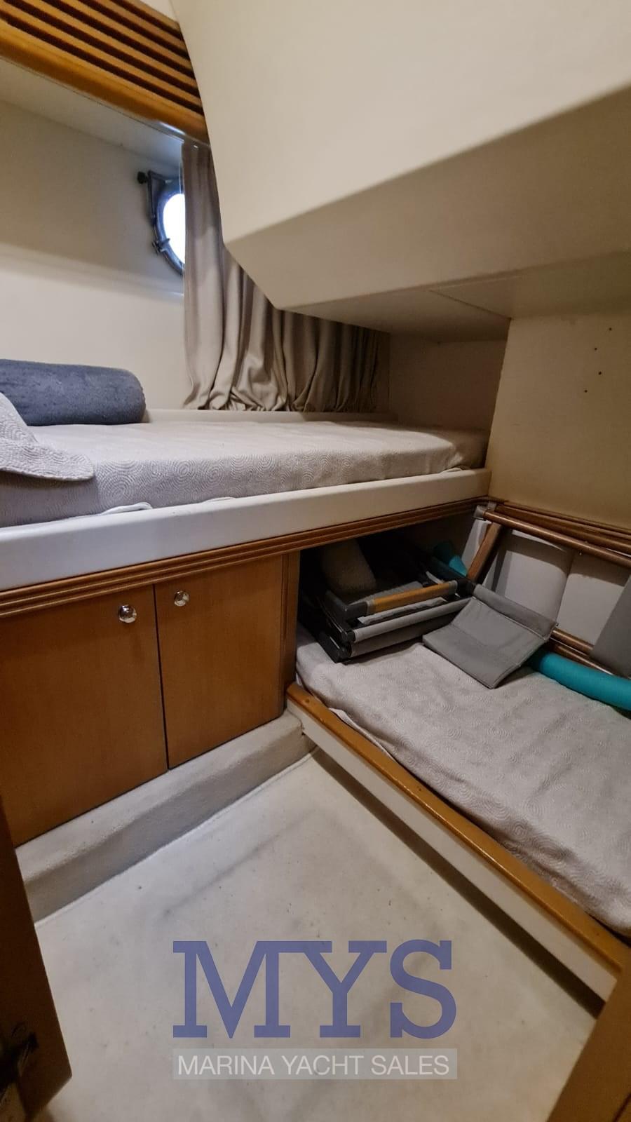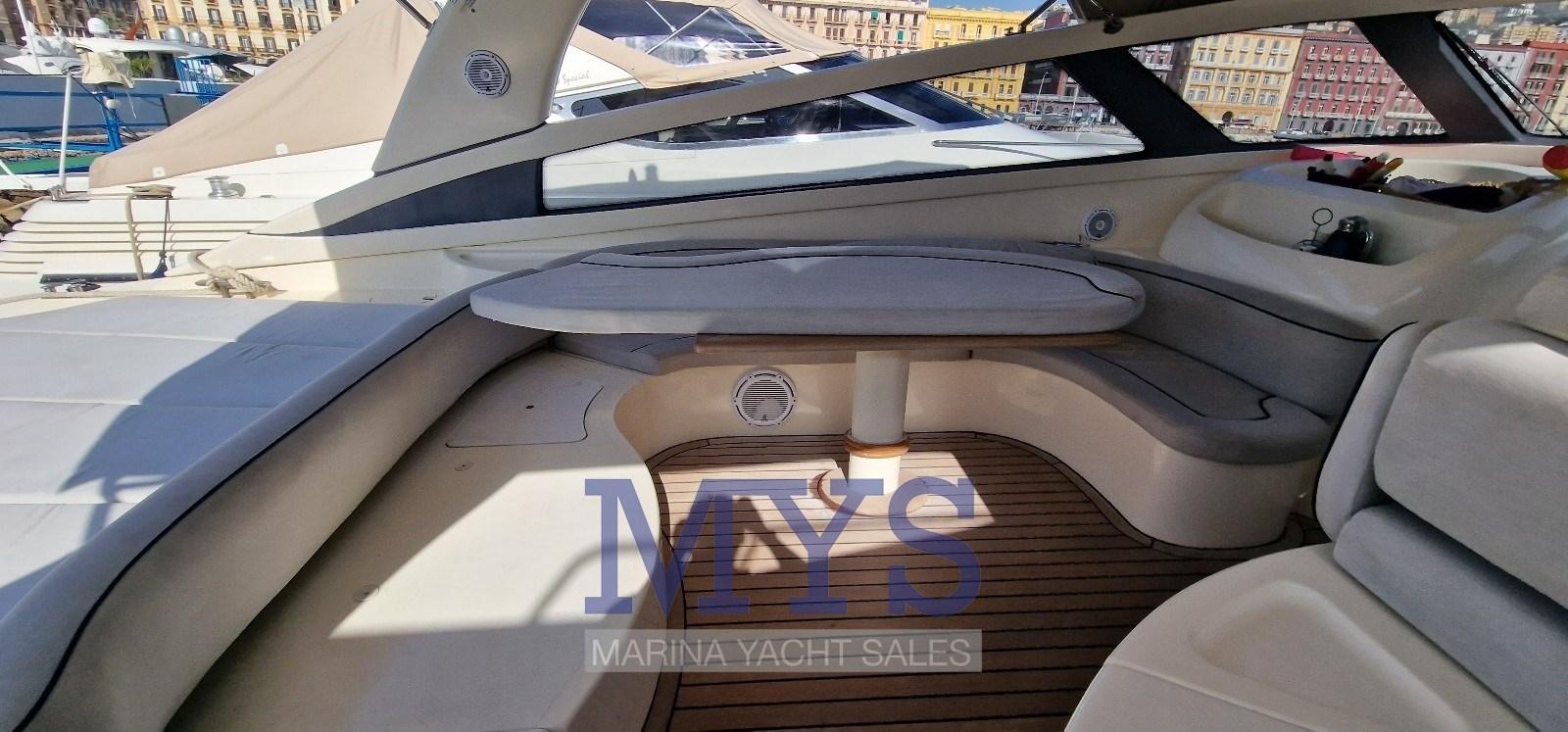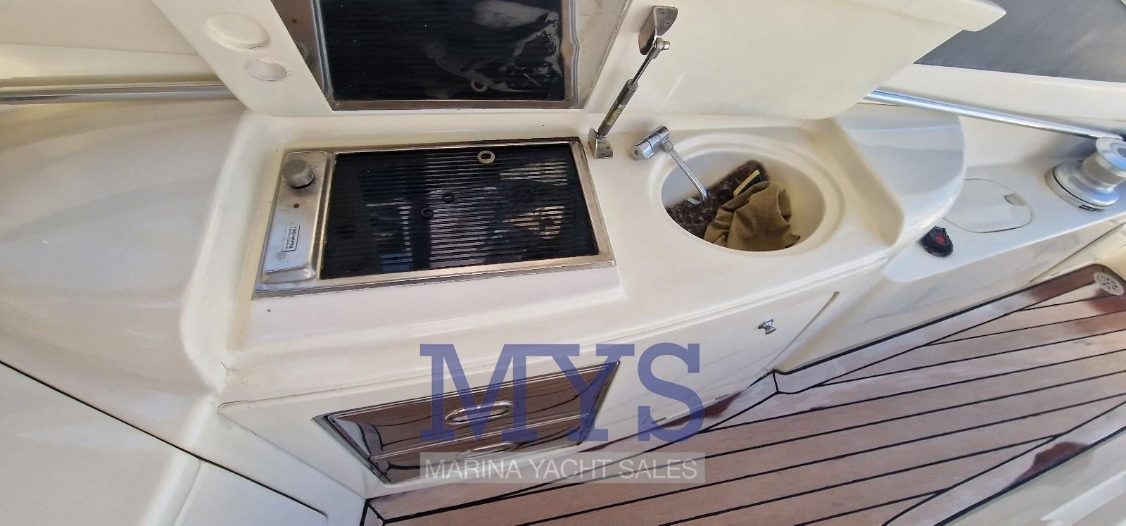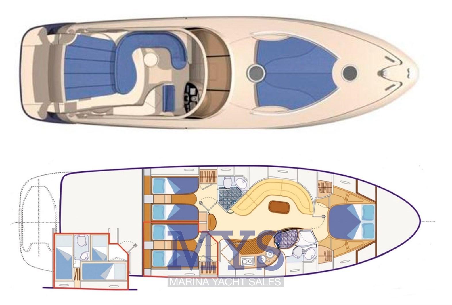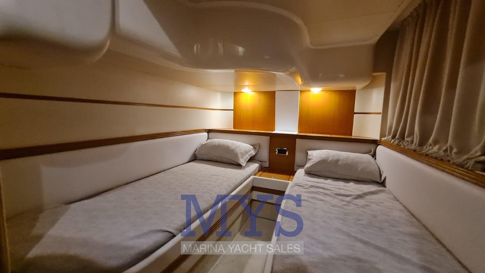 A pruavia del grande salone è disposta la cabina armatoriale con bagno privato. Verso poppa vi sono le 2 cabine ospiti e una seconda toilette. Posto di pilotaggio: sul lato di dritta del pozzetto, servito da divanetto a 2 posti. Plancia ergonomica con strumentazione motori, radiotelefono VHF, plotter con GPS, ecoscandaglio, bussola, pilota automatico con interfaccia GPS Zona carteggio: sui tavolini in pozzetto e nel salone interno Zona cucina: collocata nella zona mediana dell'imbarcazione, sul lato di dritta. Mobili base e pensili in legno pregiato; piastra cottura; microonde; mobile con frigo/freezer da 270 litri.