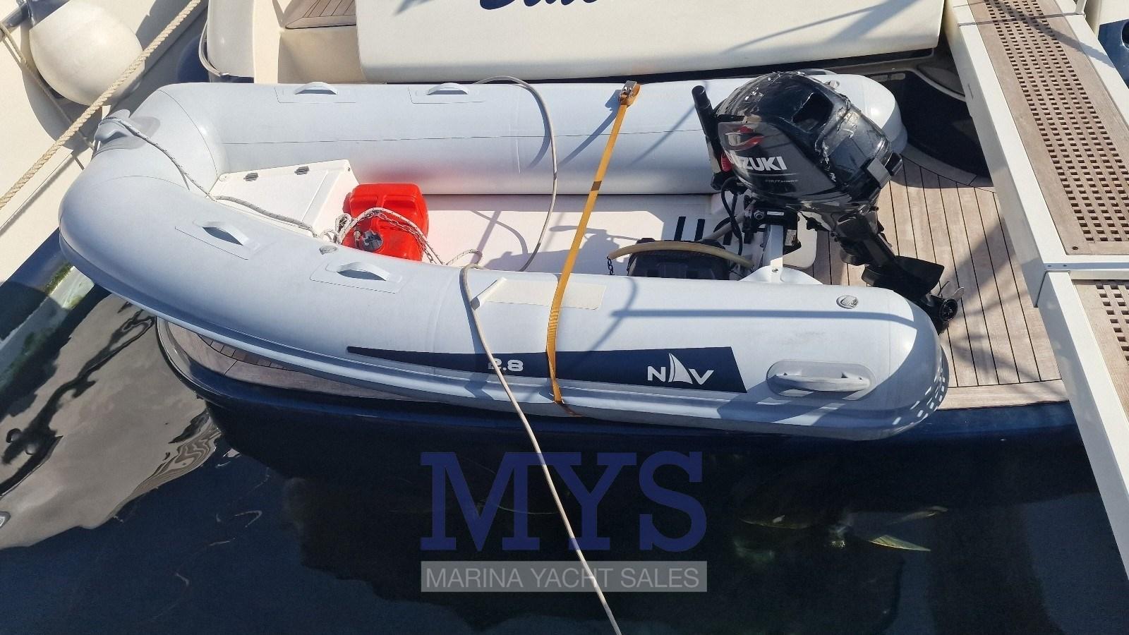 Allarme fumo/gas, Allarme motore, Allarme sentina, Ancora (Acciaio inox), Apertura Vano Motore Elettrica, Autoclave, 8 Batterie, Doccia esterna, Flap idraulici, Gruette per tender, Impianto antincendio, Indicatori Flaps, Lavandino nel Pozzetto, Luci di cortesia, Passerella (a scomparsa), Piattaforma (in teak), Pompa di sentina manuale, Pozzetto Teak, Presa 220V banchina, Presa acqua banchina, Raddrizzatore, Salpa Ancore Elettrico, Scaletta da bagno, Tavolo pozzetto, Tender (2.80), Tromba, 2 Winch tonneggio di poppa, Winch tonneggio di prua.