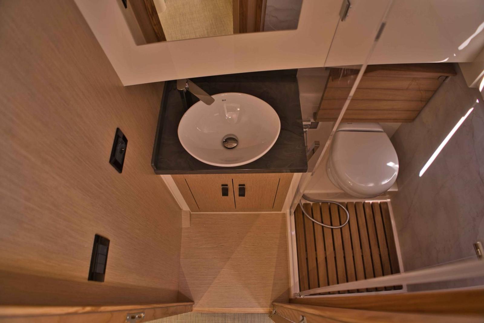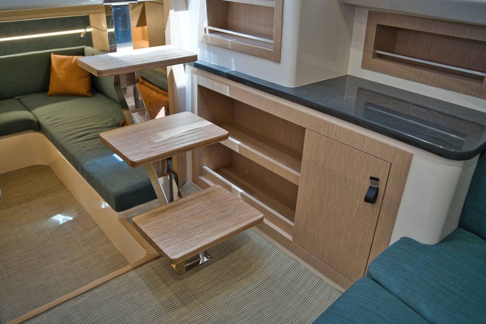 GLI INTERNI, SEPPUR COMPATTI, SORPRENDONO PER SOLUZIONI INTELLIGENTI E MODULARI CON DIVANI TRASFORMABILI CHE REGALANO DUE COMODI LETTI MATRIMONIALI, UNENDO FUNZIONALITÀ E STILE IN UN PICCOLO GIOIELLO DI DESIGN NAUTICO.