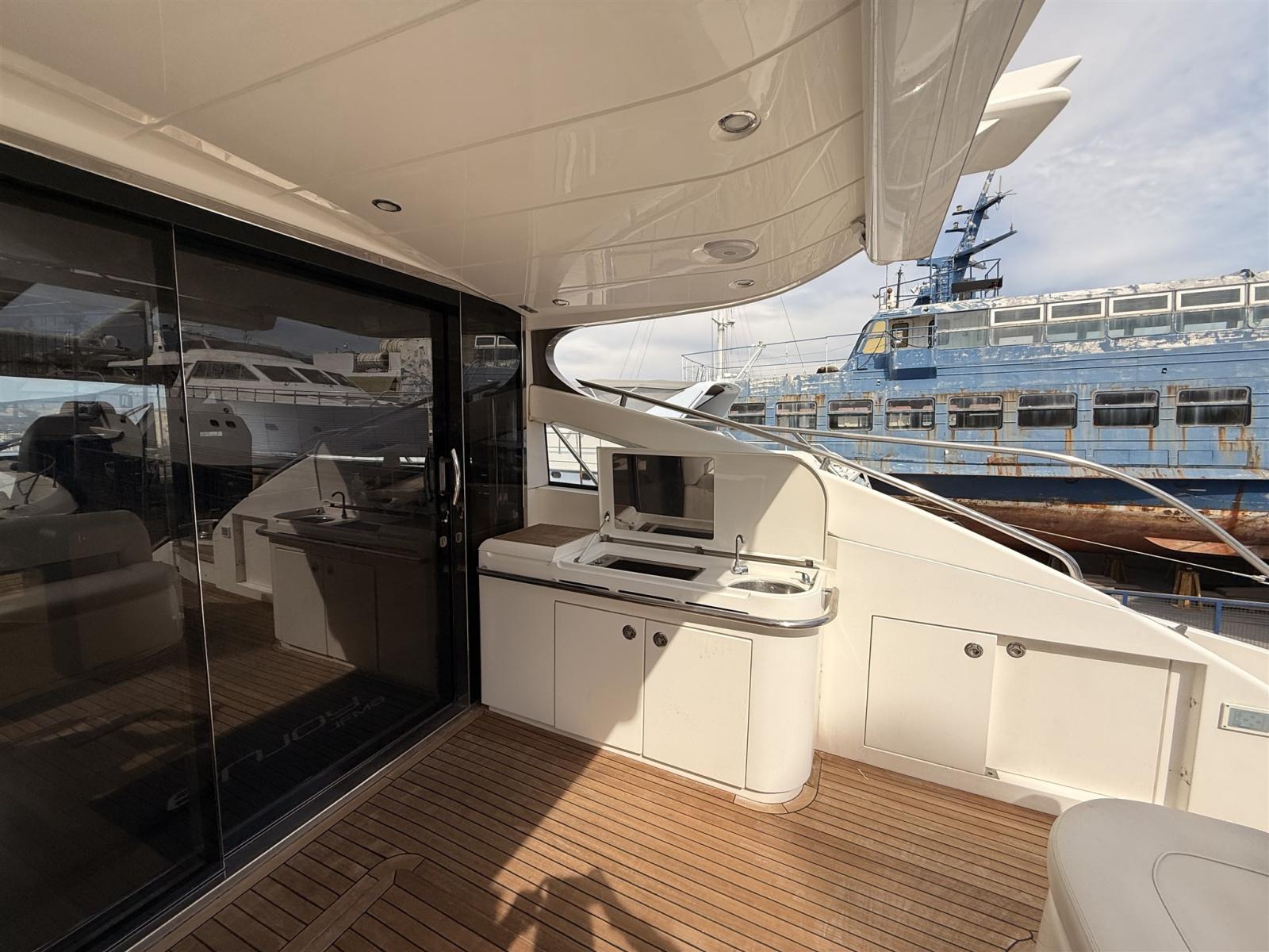 Alternatore, Autoclave, Cavo corrente di banchina, Corrimano, Doccia esterna, Flap elettrici, Flap idraulici, Garage per tender, Hard top, Lavandino nel Pozzetto, Luci di cortesia, Passerella, Piattaforma, Pompa di sentina automatica, Presa 220V banchina, Salpa Ancore Elettrico, Scaletta da bagno, Tavolo pozzetto, Winch tonneggio di poppa.
