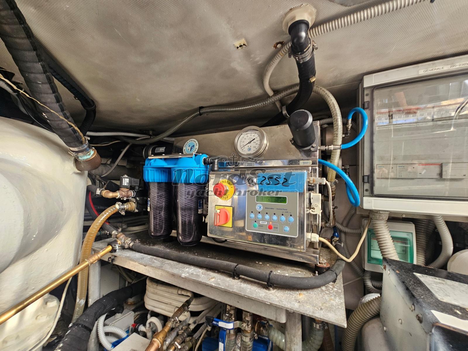 Generatore: Kohler 13 kw- Tensione di bordo: 12 / 220 V - Caricabatterie - Autoclave - Boiler - Impianto antincendio - Elica di prua - Elica di poppa - Doccia esterna - Flaps - Gru sul fly: Besenzoni - Passerella - Luci di cortesia - Luci subacquee - Plancetta - Riscaldamento - Aria condizionata - Impianto acque nere - Winch tonneggio - Zattera - Impianto acqua a pressione - Frigorifero esterno - Frigorifero sul fly - Mobile bar: Si in dinette - Lavastoviglie - Lavatrice - Forno - Frigorifero - Congelatore - Bimini top: si in acciaio - Cuscineria prendisole - Coprifinestrature esterne - Norvegese