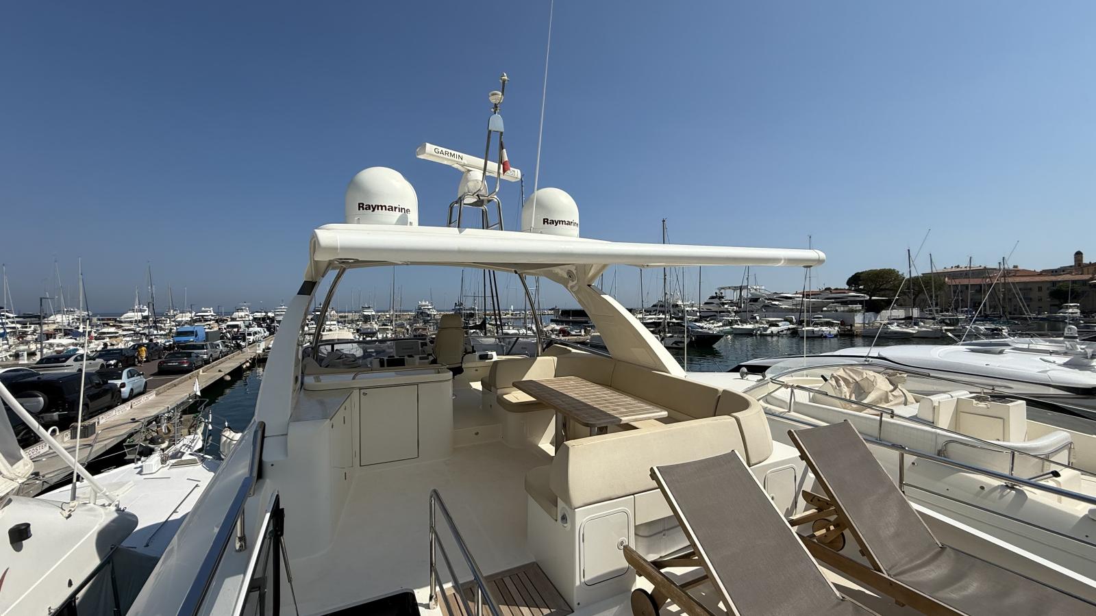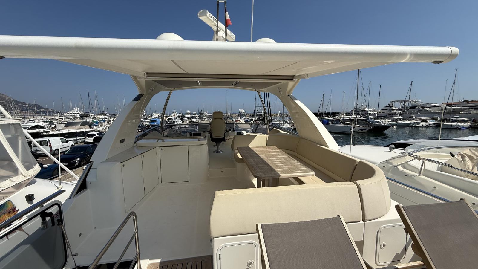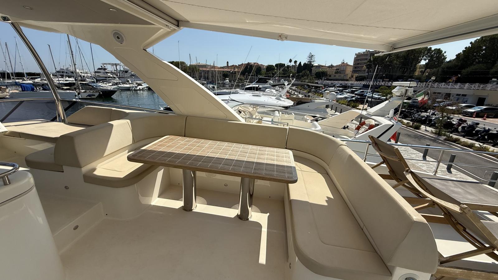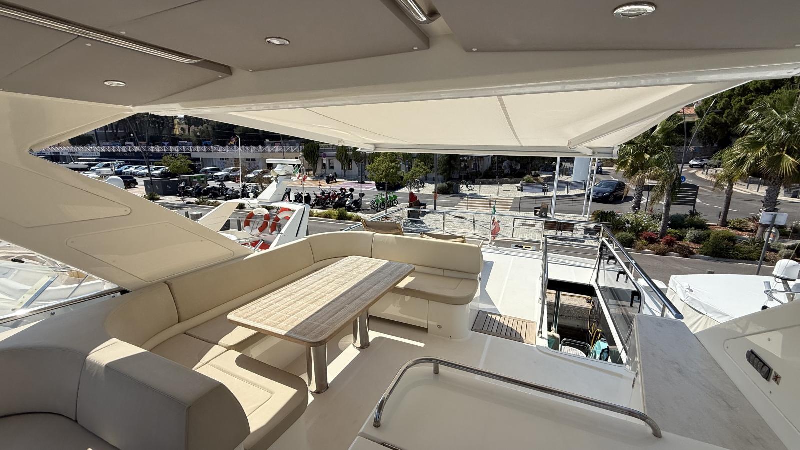 Un flybridge con solarium e zona pranzo