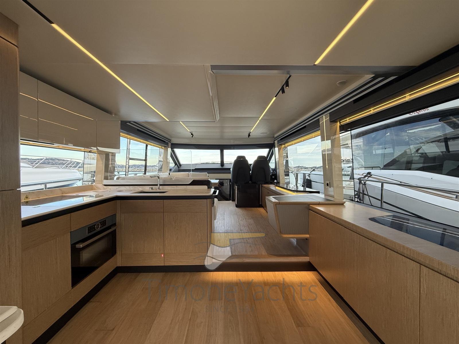 Allarme fumo/gas, Allarme motore, Allarme sentina, Alternatore, Auto Dynamic Trim Interceptor, Autoclave, Camminamenti laterali in teak, Cavo corrente di banchina, Doccia esterna, Doppia timoneria, Flap elettrici, Hard top, Indicatori Flaps, Lavaggio catena, Lavandino nel Pozzetto, Luci di cortesia, Passerella, Piattaforma, Pompa di sentina automatica, Ponte in teak, Porta ingresso, Porta laterale, Pozzetto Teak, Presa 220V banchina, Presa acqua banchina, Scaletta da bagno, Stabilizzatori (Seakeeper), Tavolo pozzetto, Tromba, Winch tonneggio di poppa, Winch tonneggio di prua.