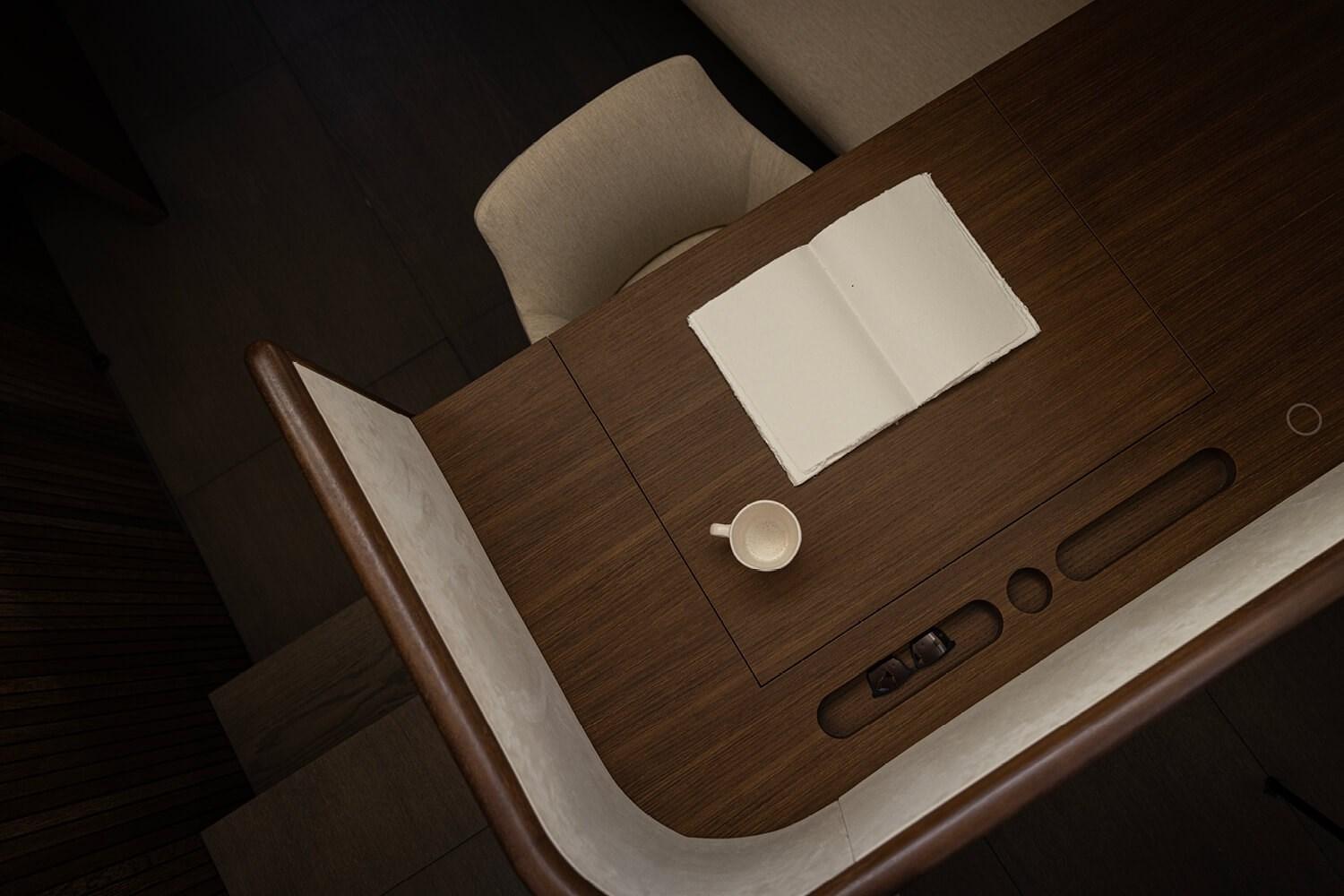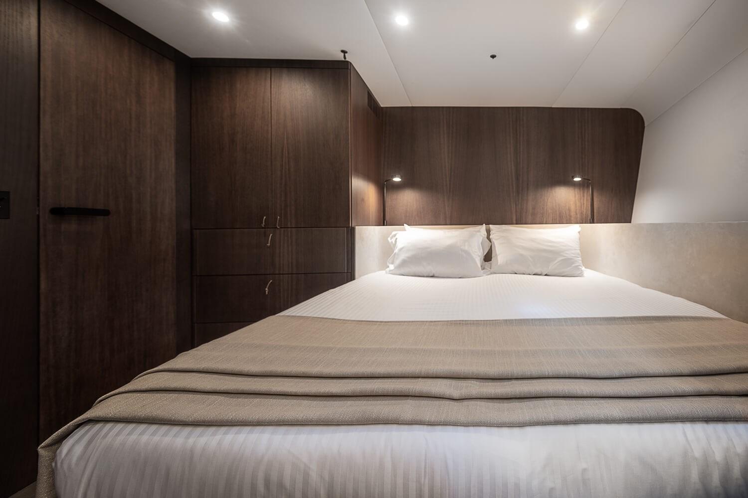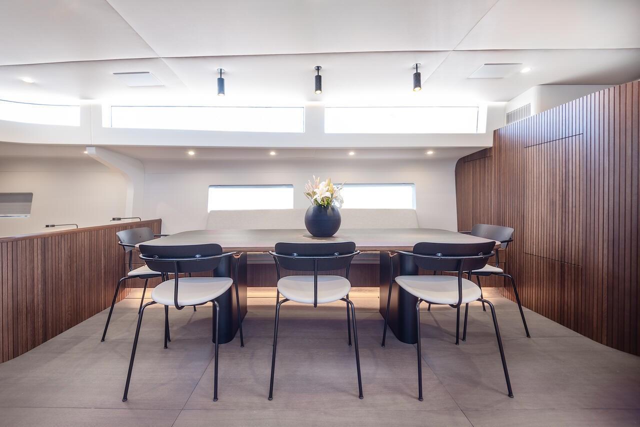 Gli interni comprendono tre cabine ospiti con bagno privato e due cabine equipaggio, disposti attorno a un salone luminoso dal design contemporaneo. La cucina è completamente attrezzata con elettrodomestici Miele e frigorificazione in acciaio. Il teak naturale sul ponte e il pozzetto ampio favoriscono la vita all’aperto, completati da passerella idraulica Besenzoni e tender da 4,25 m.
