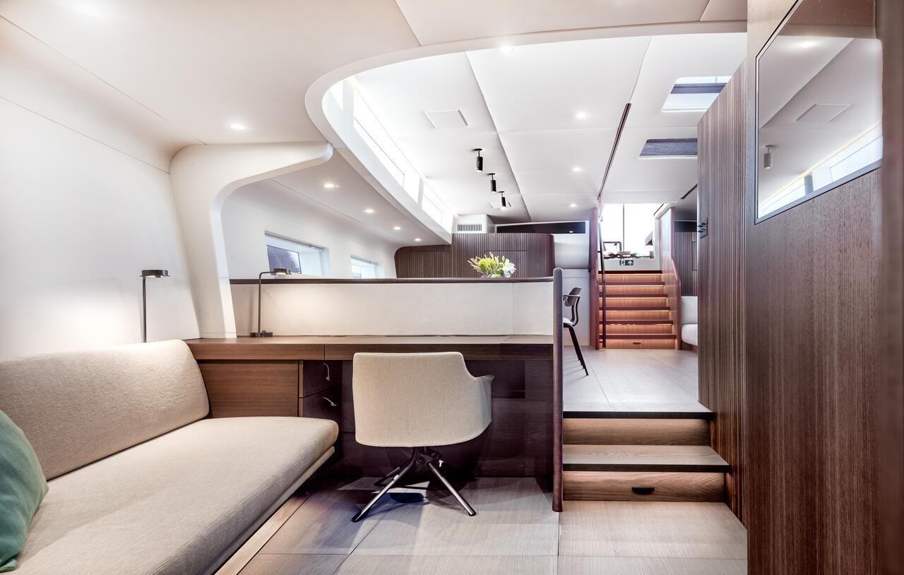 Il ponte presenta un rig Axxon in carbonio, sistemi di avvolgimento idraulici e una strumentazione B&G H5000 con display Nemesis. A bordo sono presenti un’unità di climatizzazione da 100.000 BTU, dissalatore Schenker ZEN 150, generatore Fischer Panda 25i PMS e 30 pannelli solari integrati sul bimini per una maggiore autonomia.