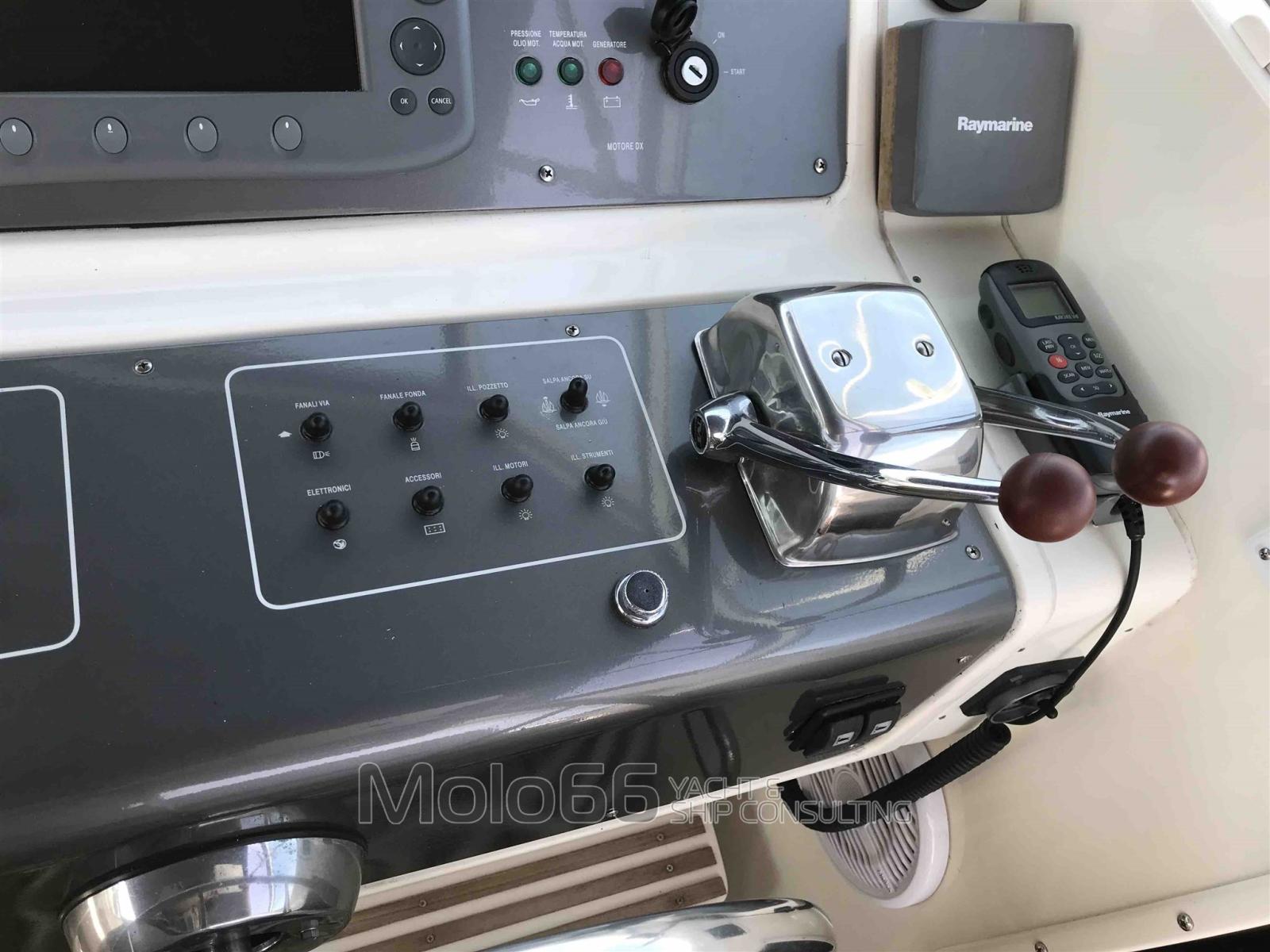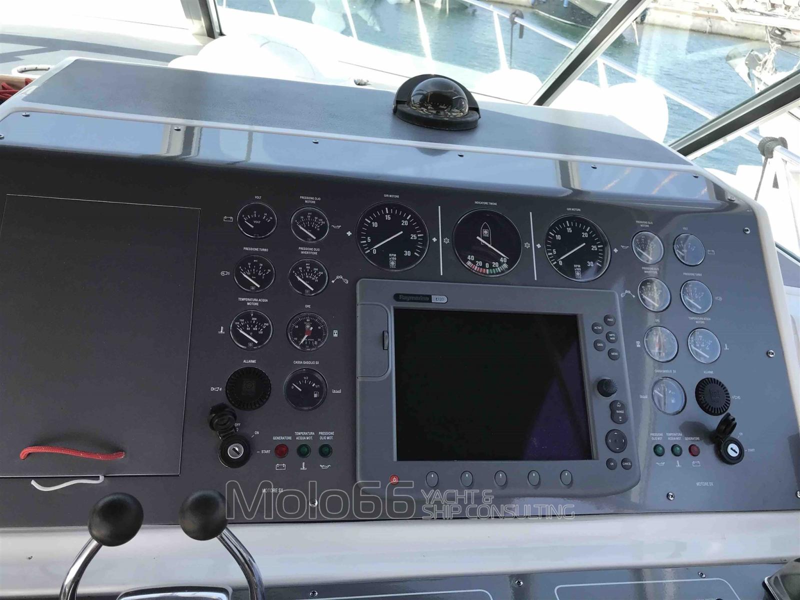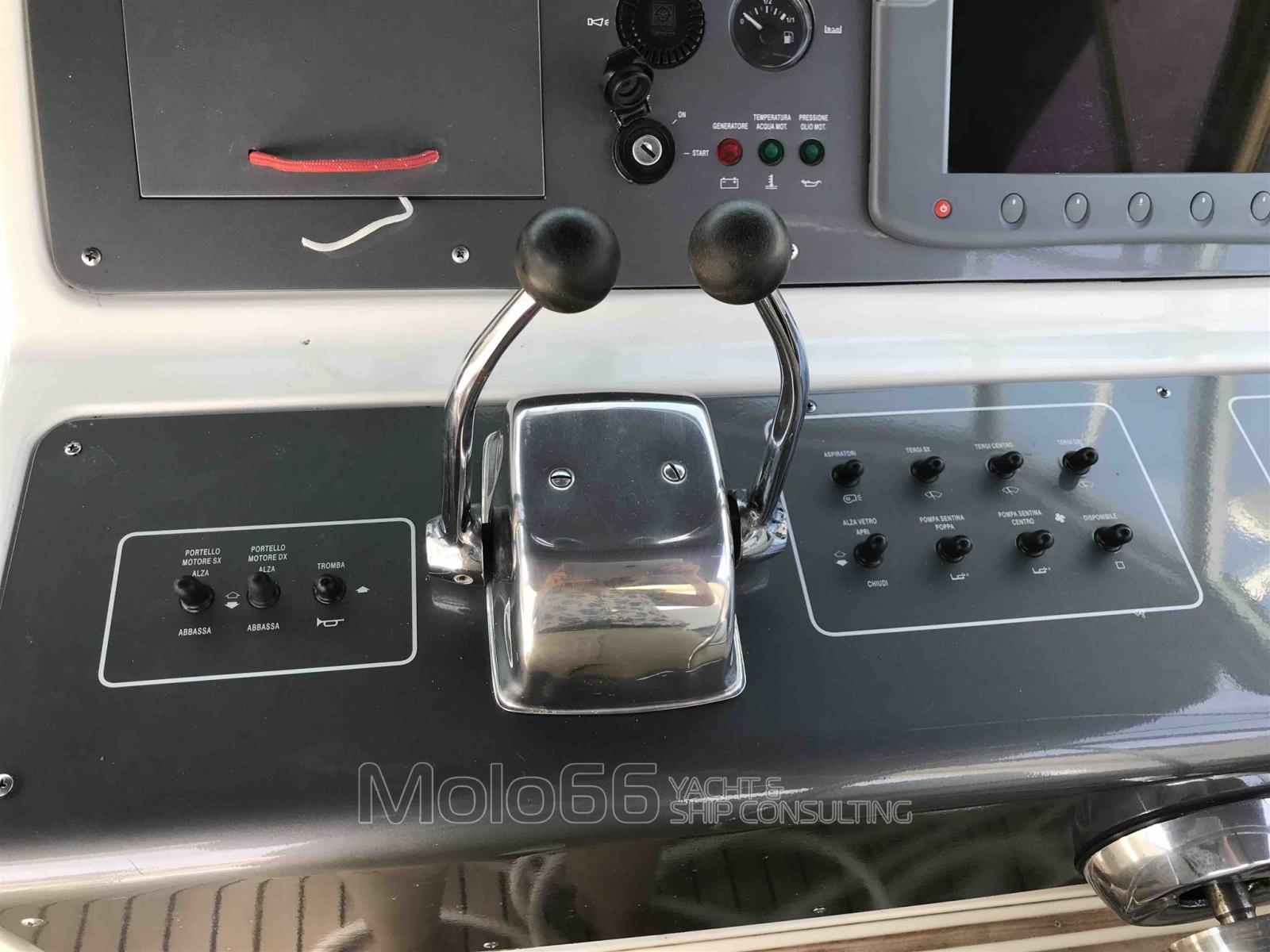 Cruscotto con manette marce e gas e con strumentazione temperatura acqua e olio motori, volt, pressione olio, invertitori e turbine, contaore, livello carburante e angolo di barra con allarmi acustici.