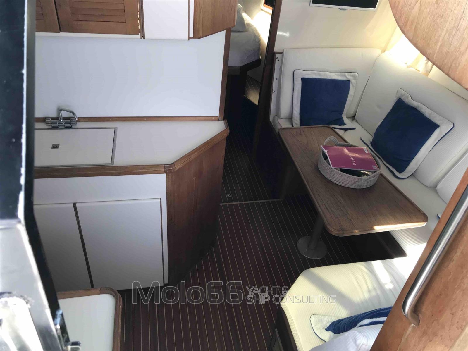 Una cabina armatore a prua con letto matrimoniale, bagno con doccia separata, dinette trasformabile in letto matrimoniale , angolo cottura con lavandino , fornello 2 piastre a gas ,frigorifero, armadietti vari.