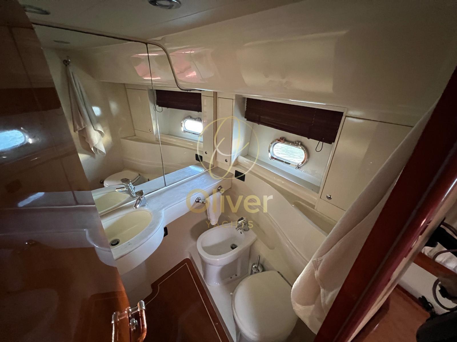 La cucina è completa e funzionale, dotata di lavastoviglie, lavasciuga e microonde, una configurazione ideale sia per uso armatoriale che per lunghe crociere. La zona notte offre cabine spaziose e ben isolate, con cabina armatoriale full-beam, bagno privato con box doccia separato e finiture di qualità. Le cabine ospiti mantengono lo stesso standard di comfort, con bagni dedicati e ottima altezza interna.