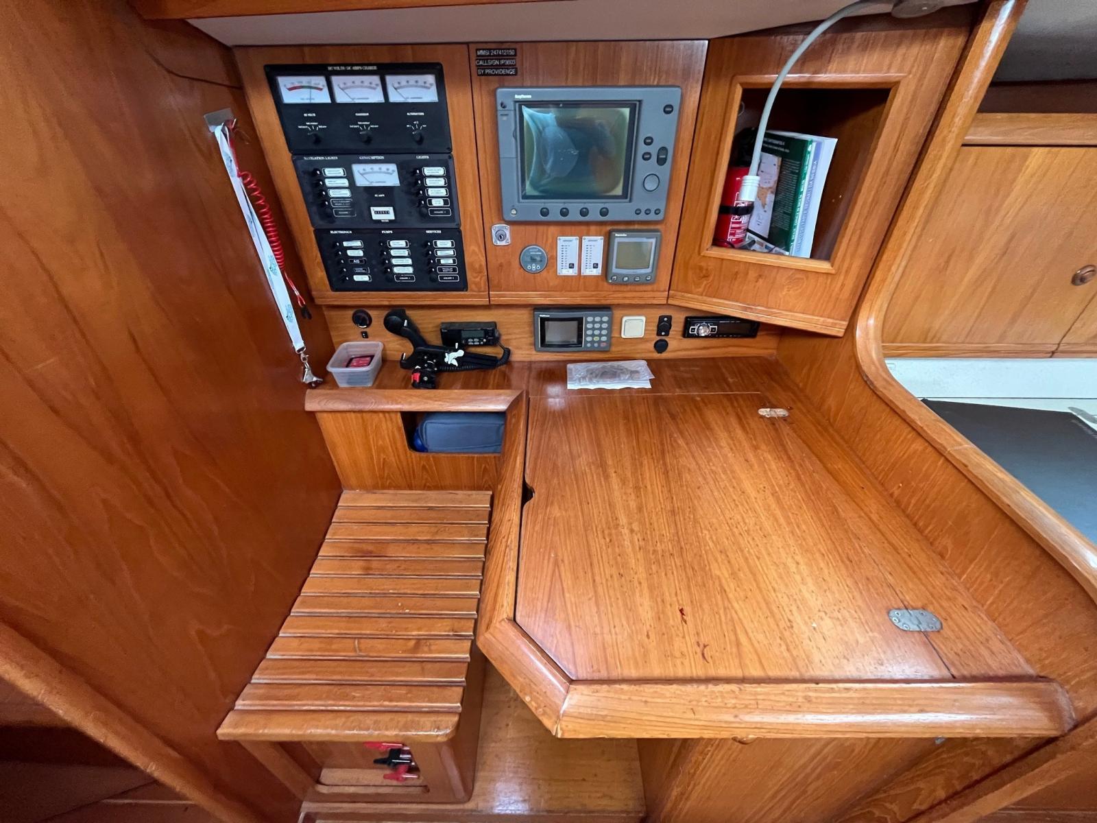 AIS (2022 AIS (HA102, CSTDMA) Sender+Receiver incl. Separate AIS Antenna (Scout KS-30)), Bussola (PLASTIMO), Computer di bordo (MINIPLEX), Contametri catena (Kettenzählwerk Iris 600017, Remote control anchor windless from cockpit), Contamiglia (RAYMARINE), Display (RAYMARINE), Pilota automatico (Raymarine SPX10, SmartPilot st6001, Linear Drive Type1), Radio VHF (ICOM), Stazione vento (RAYMARINE).