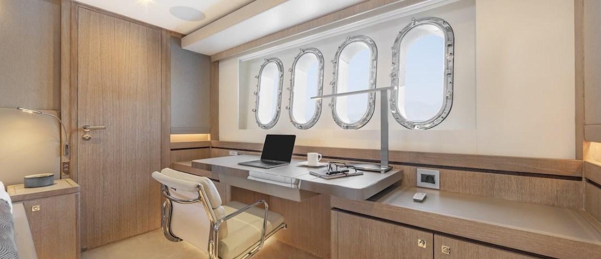 1 armatoriale matrimoniale king size a tutto baglio centro nave con scrivania, area salotto e cabina armadio; 1 VIP matrimoniale a prua; 1 ospite doppia (letti scorrevoli); 1 ospite a castello; bagno privato in ogni cabina (cabine doccia e pareti bagni in corian e ceramica, wc/bidet elettrici Planus).