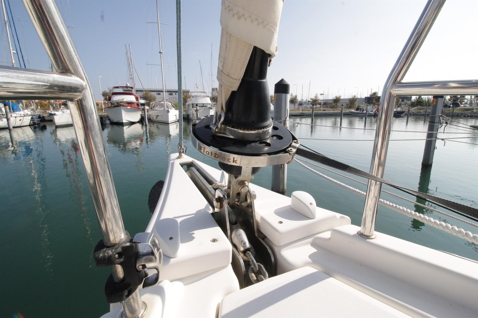 Attrezzatura Gennaker, Attrezzatura Spi, Avvolgi Fiocco (à sangle FLAT-DECK), Carrelli a sfera randa (rail Ebb Tide), Lazy Bag, Lazy Jack, 2 Sail Bag (sur pont pour voiles d'avant), Vang, Vang rigido.