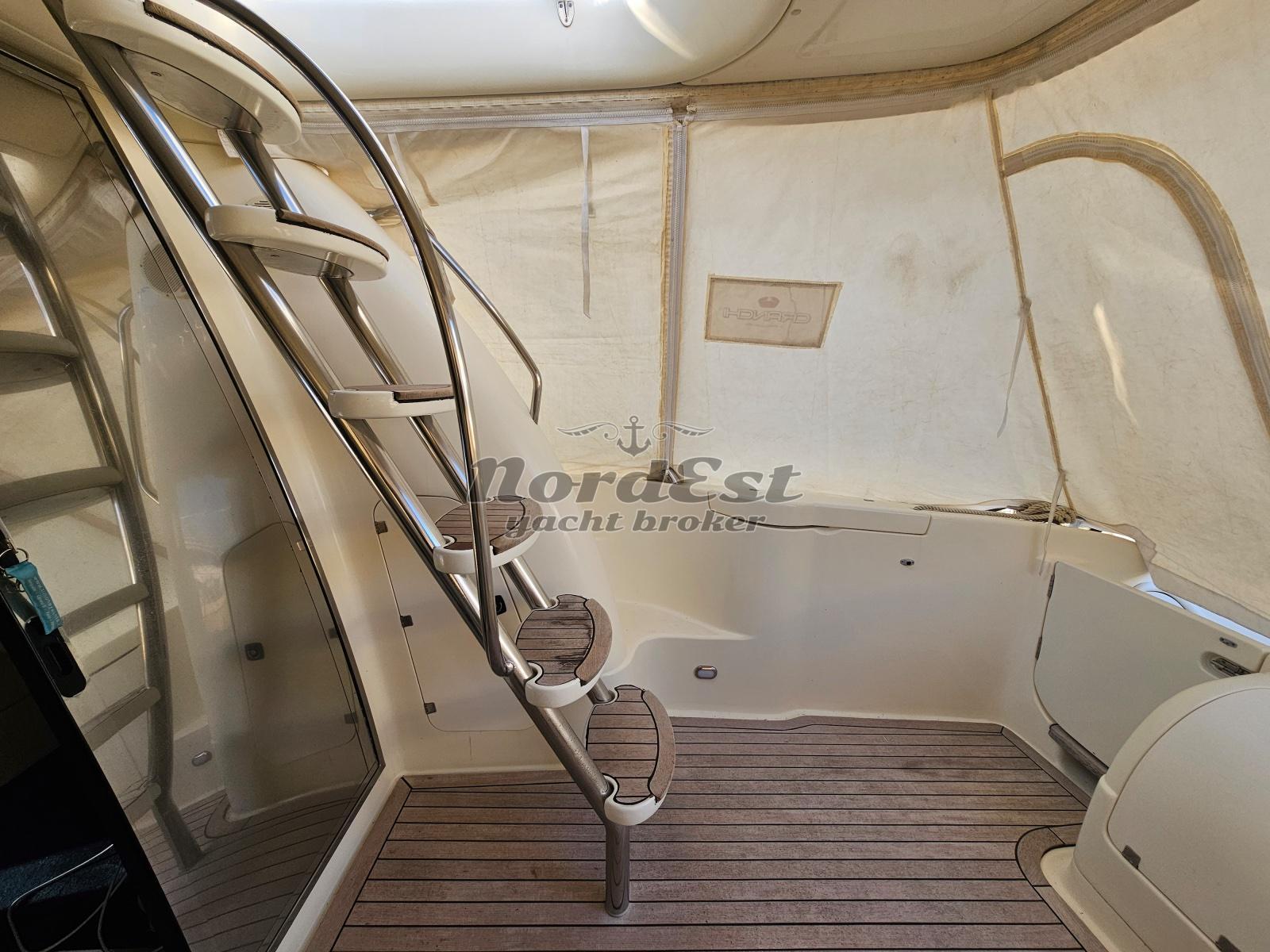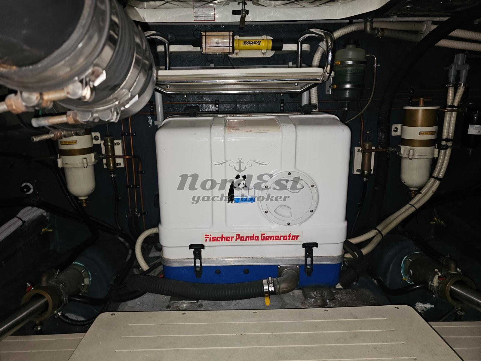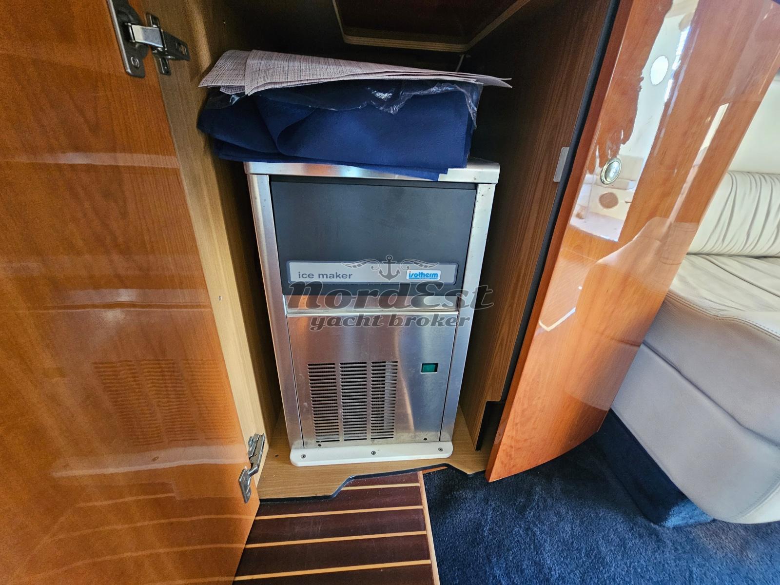 Generatore 7 kw - Tensione di bordo: 24 / 220 V - Batterie n.: 4 da 200 Ah - Caricabatterie - Autoclave - Boiler - Impianto antincendio - Elica di prua - Elica di poppa - Doccia esterna - Flaps - Passerella - Luci di cortesia - Plancetta: in teak - Aria condizionata: tutti gli ambienti - Impianto acque nere - Impianto acqua a pressione - Frigorifero esterno - Frigorifero sul fly - Mobile bar: si in dinette e fly - Forno: microonde - Frigorifero - Congelatore - Icemaker - Cassaforte - Bimini top: in acciaio - Cuscineria prendisole - Telo copriscafo - Coprifinestrature esterne - Norvegese