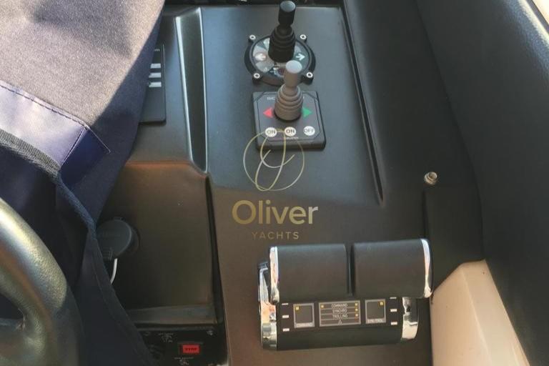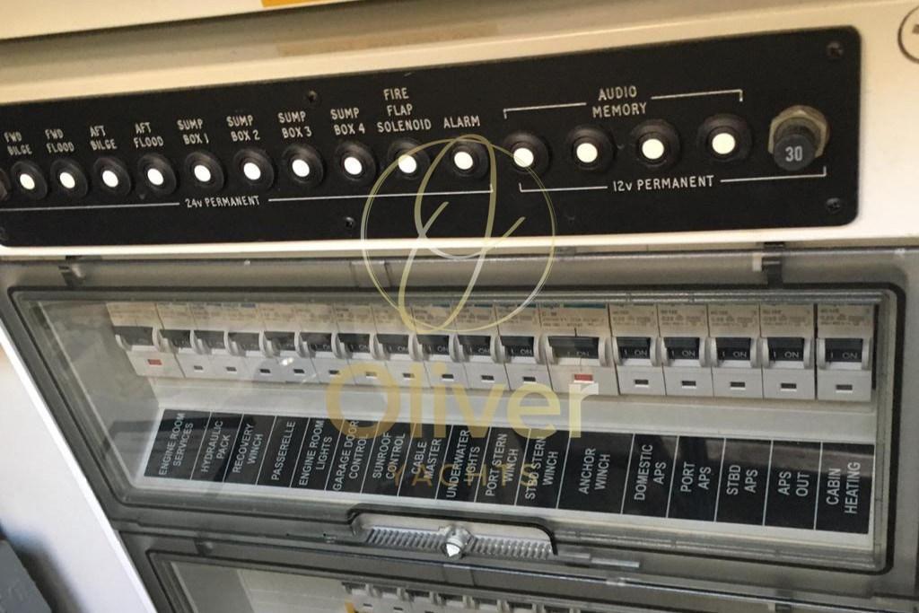 Angolo barra, Antenna radar, Comando motori elettronico, Computer di bordo, Contametri catena, Cronometro, Display, DSC vhf, Ecoscandaglio (SIMRAD), Mappe e guide, Pilota automatico (SIMRAD), Plotter con antenna GPS, Quadro comandi, Sedile Copilota, Strumenti di misura per motori.