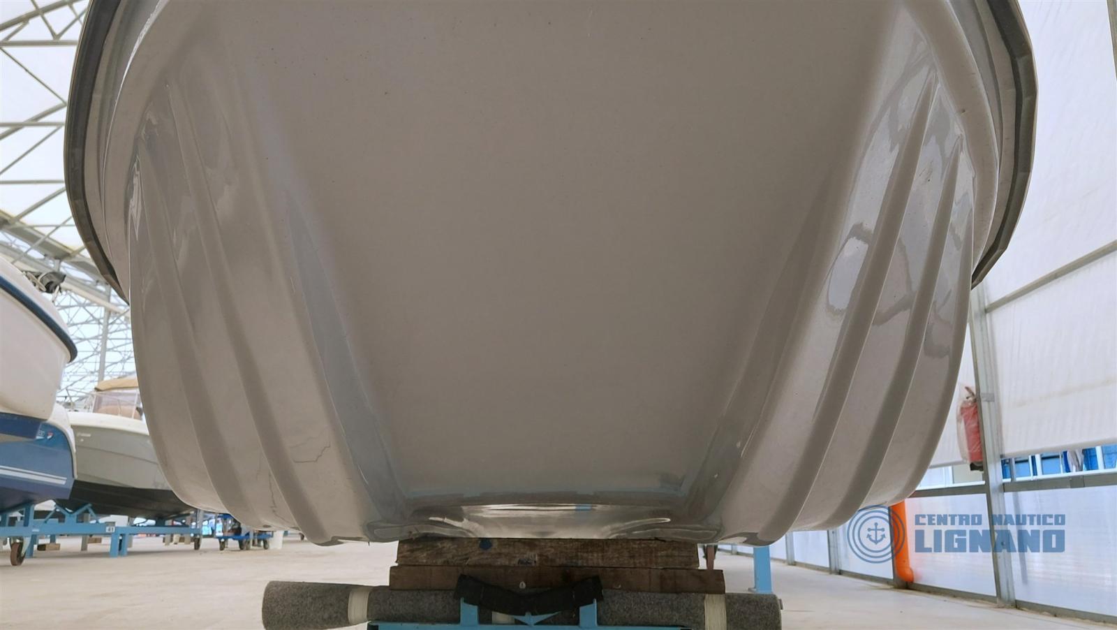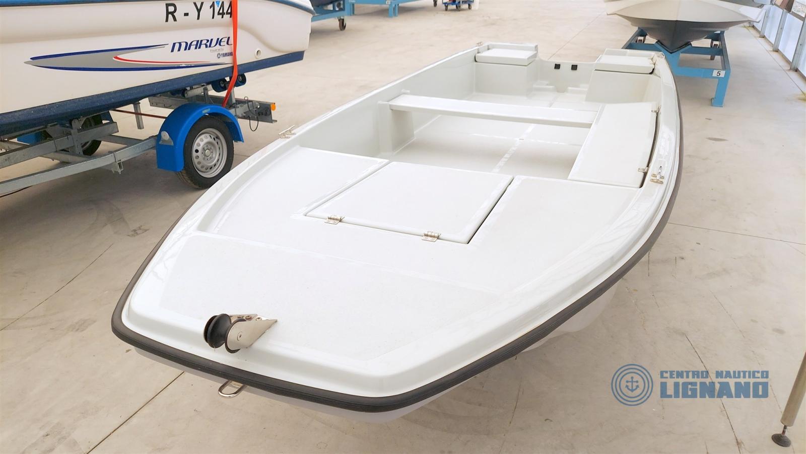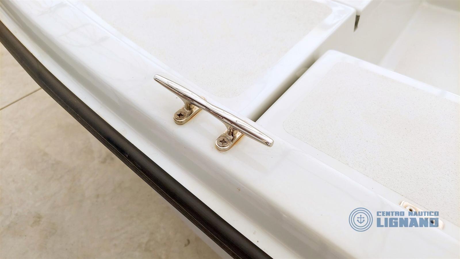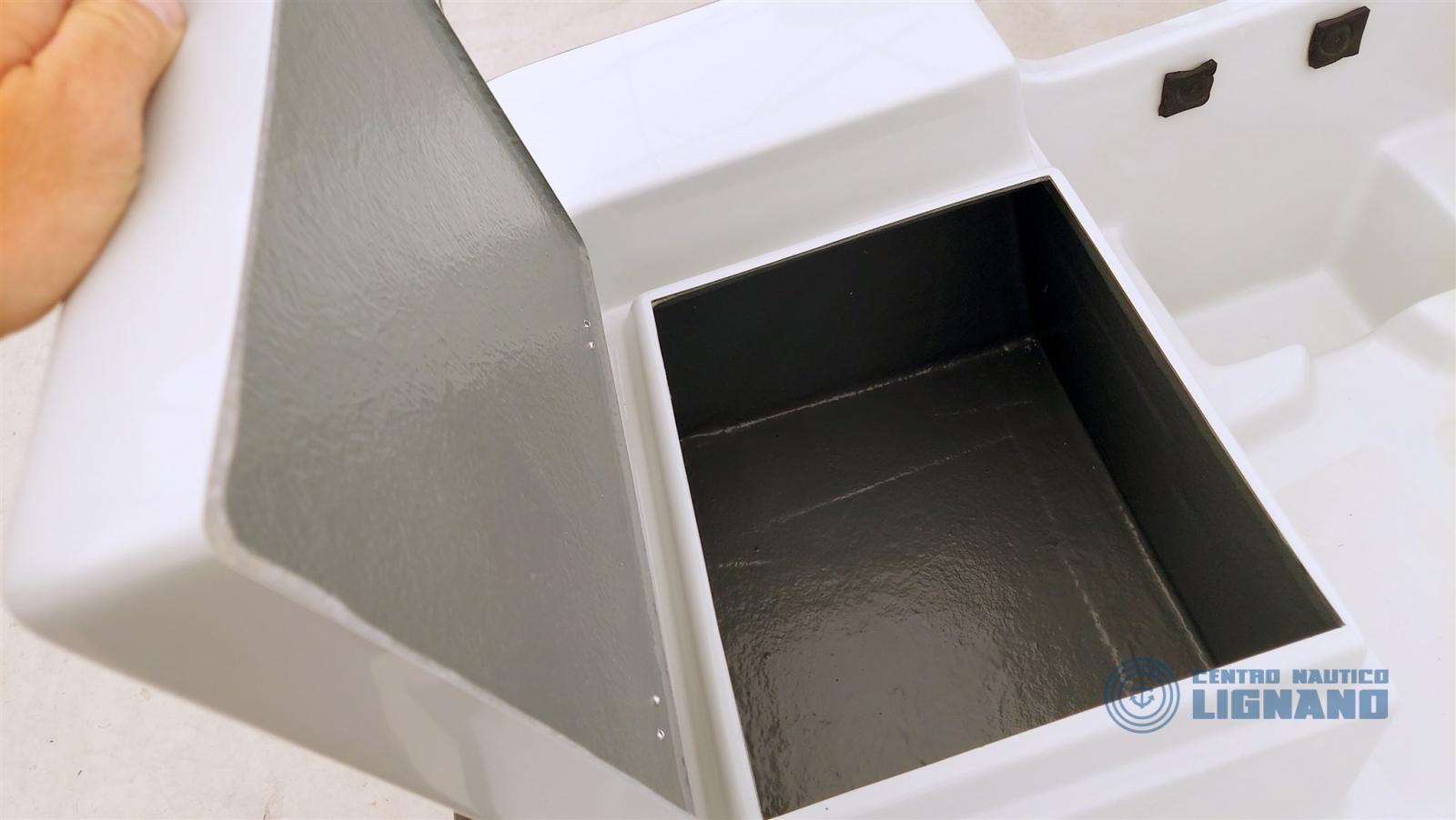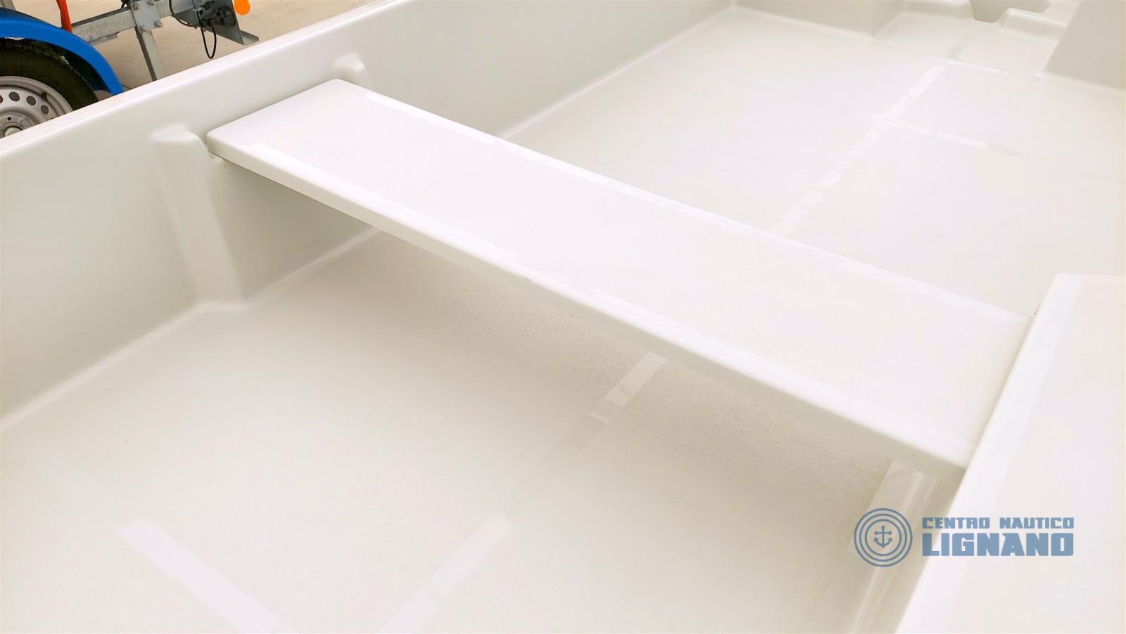 4 bitte di plastica, 3 ganci di sollevamento, musone di prua, superficie antiscivolo, gavoni, panca removibile