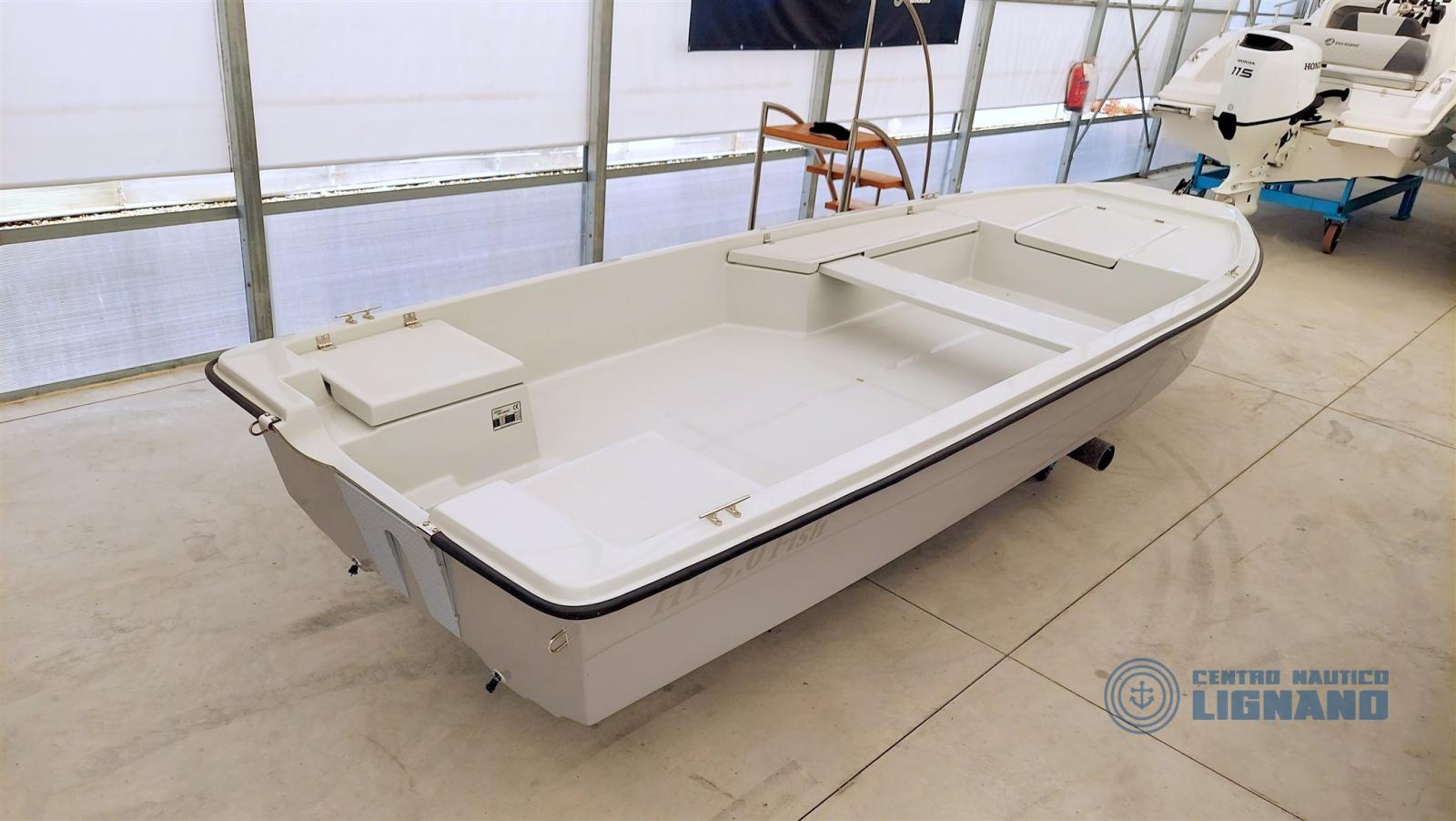 La versione 5.0 Base è 4,95 mt per 1,70 mt, pesa senza motore 240 Kg, la portata è di 6 persone, certifica CE - D, colore standard Hiros White, supporta massimo un motore da 40Hp effettivi. Nel prezzo standard è compreso anche: 4 bitte di plastica, 3 ganci di sollevamento, musone di prua, superficie antiscivolo, gavoni, panca removibile. Ordinando la barca su misura è possibile personalizzare il colore della coperta e/o dello scafo (disponibili tinte Soft Gray, Miliraty Gray, Dark Gray, Ocean Blue, Forest, Canneto). Inoltre la lista accessori opzionali sono: bitte in acciaio inox, supporto motore ausiliario, strozzascotte, chiusure con lucchetto per gavoni, tienitibene in acciaio inox, kit elettrico (luce 360°, pompa di sentina automatica, pannello comandi), luce led di cortesia, sedile pesca Tempress Pro Bax, sedile pesca Tempress Navistyle, tendalino in alluminio, telo completo, cuscineria di prua.