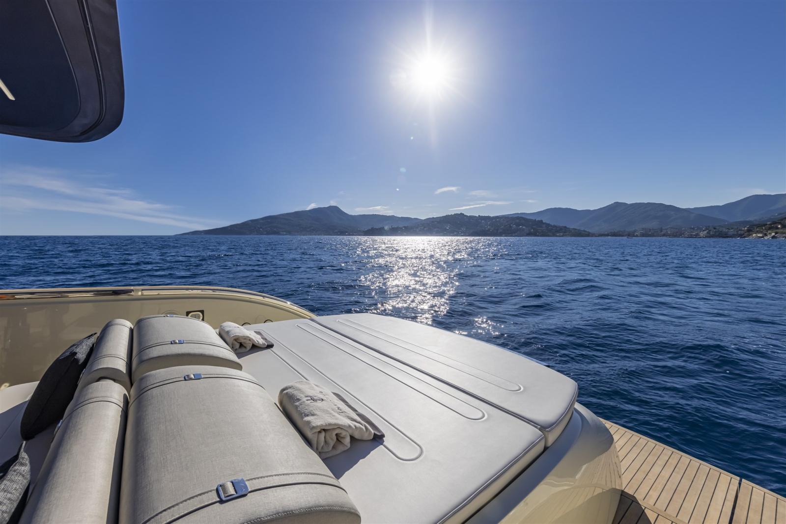 Allarme motore, Apertura Vano Motore Elettrica, Auto Dynamic Trim Interceptor, Autoclave, Camminamenti laterali in teak, Cavo corrente di banchina, Colorazione speciale (Wild Bronze), Doccia esterna, Flap elettrici (Interceptor), Hard top (carbonio), Indicatori Flaps, Lavandino nel Pozzetto, Luci di cortesia, Luci subacquee, Parabordi, Passerella (idraulica), Piattaforma (idraulica - tender lift), Pompa di sentina automatica, Pozzetto Teak, Presa 220V banchina, Salpa Ancore Elettrico, Scaletta da bagno, Tromba, Winch Elettrico (risalita tender).