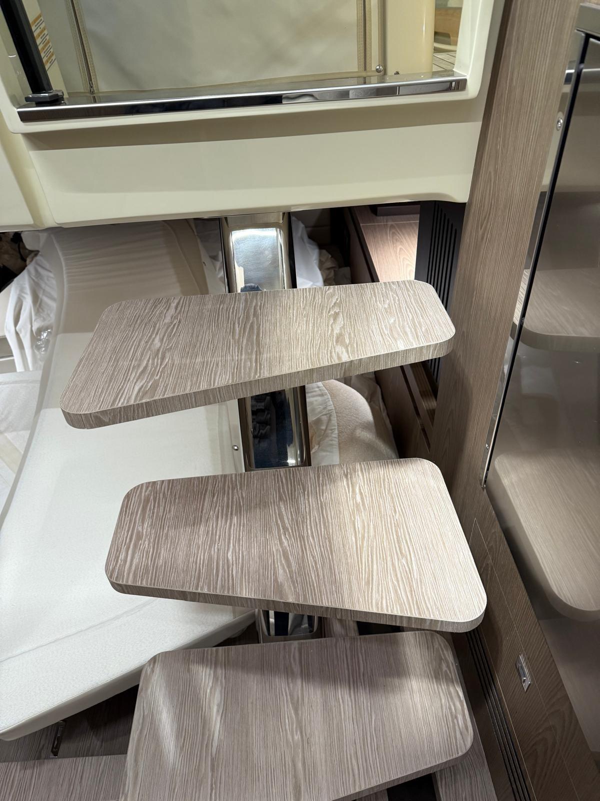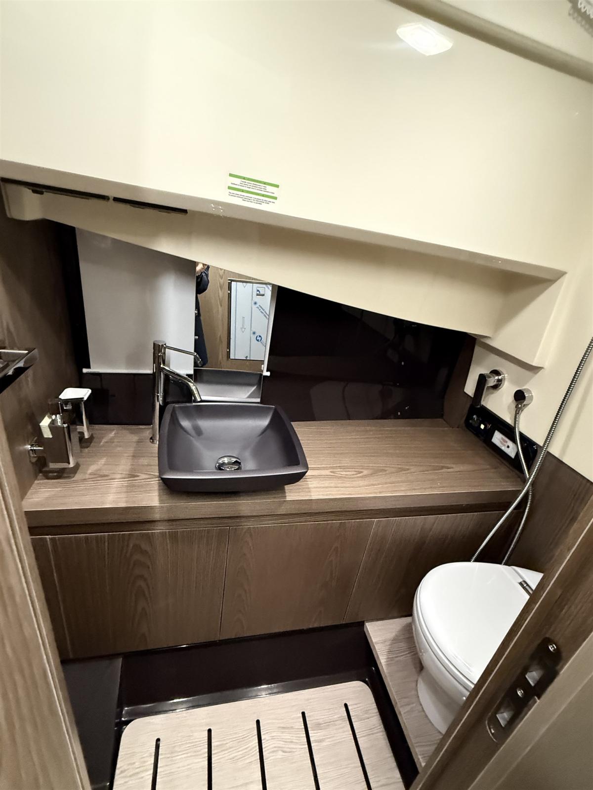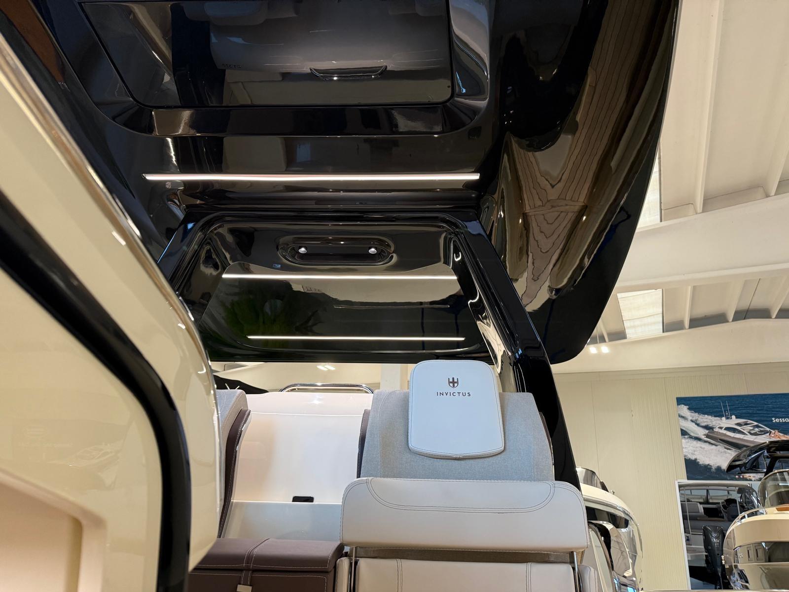 Allarme motore, Autoclave, Camminamenti laterali in teak, Colorazione speciale (WILD BRONZE), Doccia esterna, Flap elettrici, Hard top, Impianto antincendio, Indicatori Flaps, Lavandino nel Pozzetto, Luci di cortesia, Piattaforma, Pompa di sentina automatica, Pozzetto Teak, Presa 220V banchina, Salpa Ancore Elettrico, Scaletta da bagno, Tavolo pozzetto, Tromba.