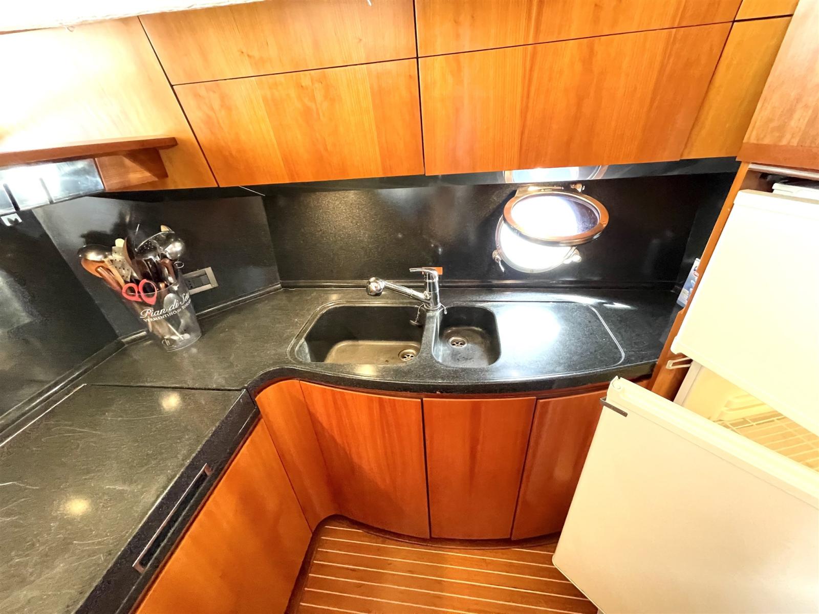 Acqua Calda, BBQ/ Grill (Sul fly), Boiler, Clima reversibile, Dissalatore, Impianto acque nere, Pavimento interno in legno, Prese interne 12v, Prese interne 220v, Serbatoio Acque Nere, WC marino elettrico.