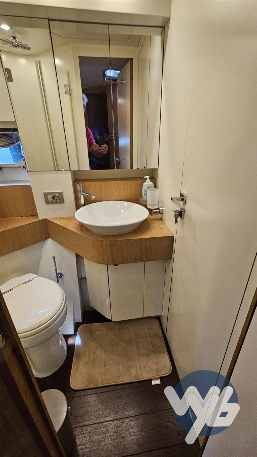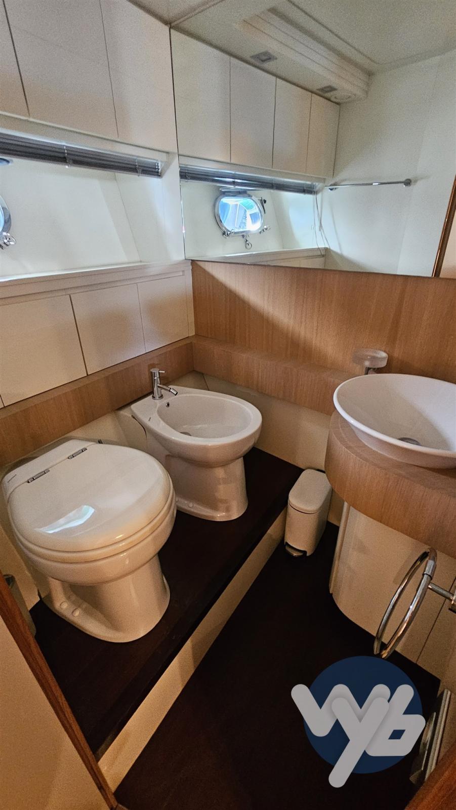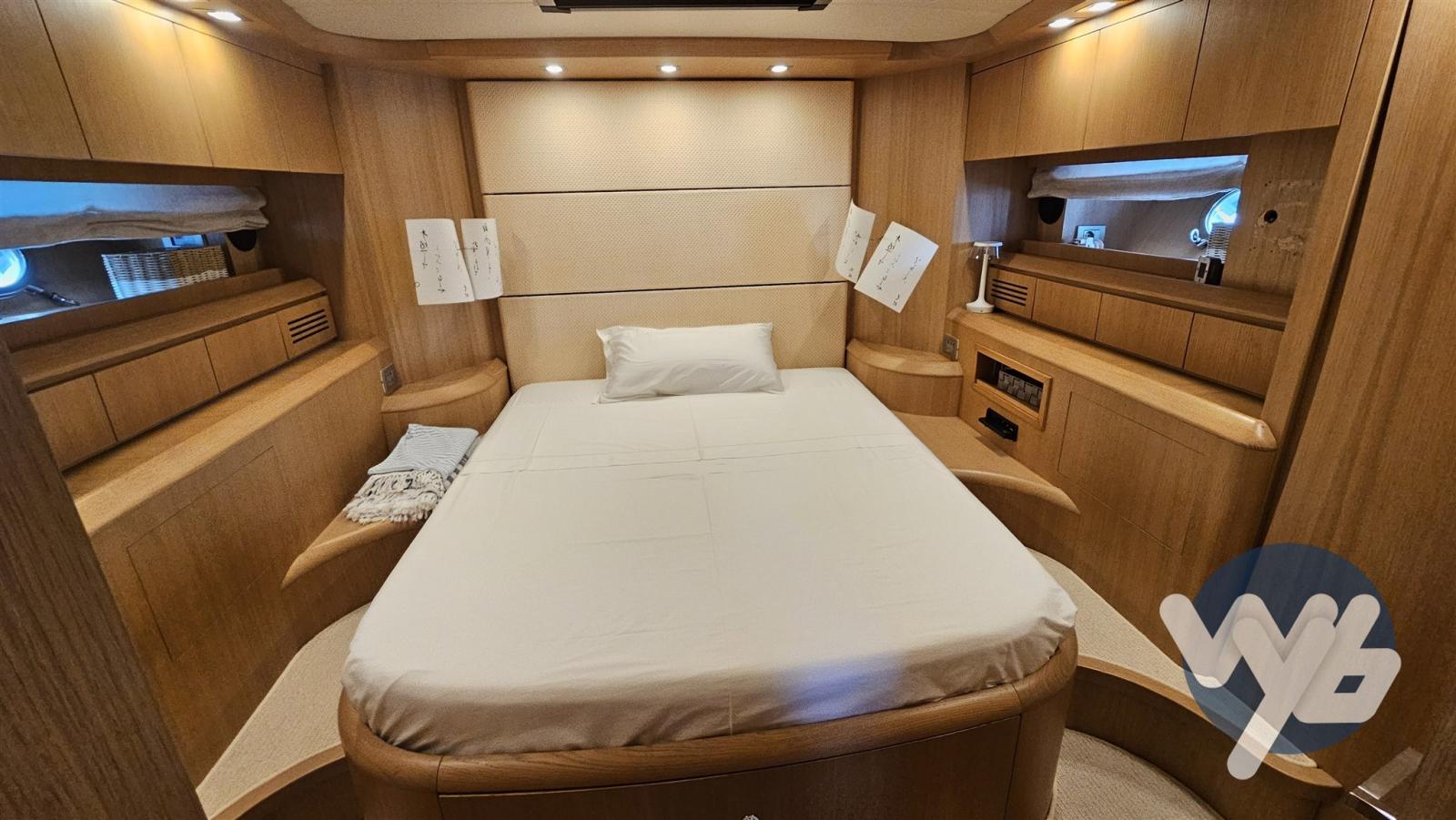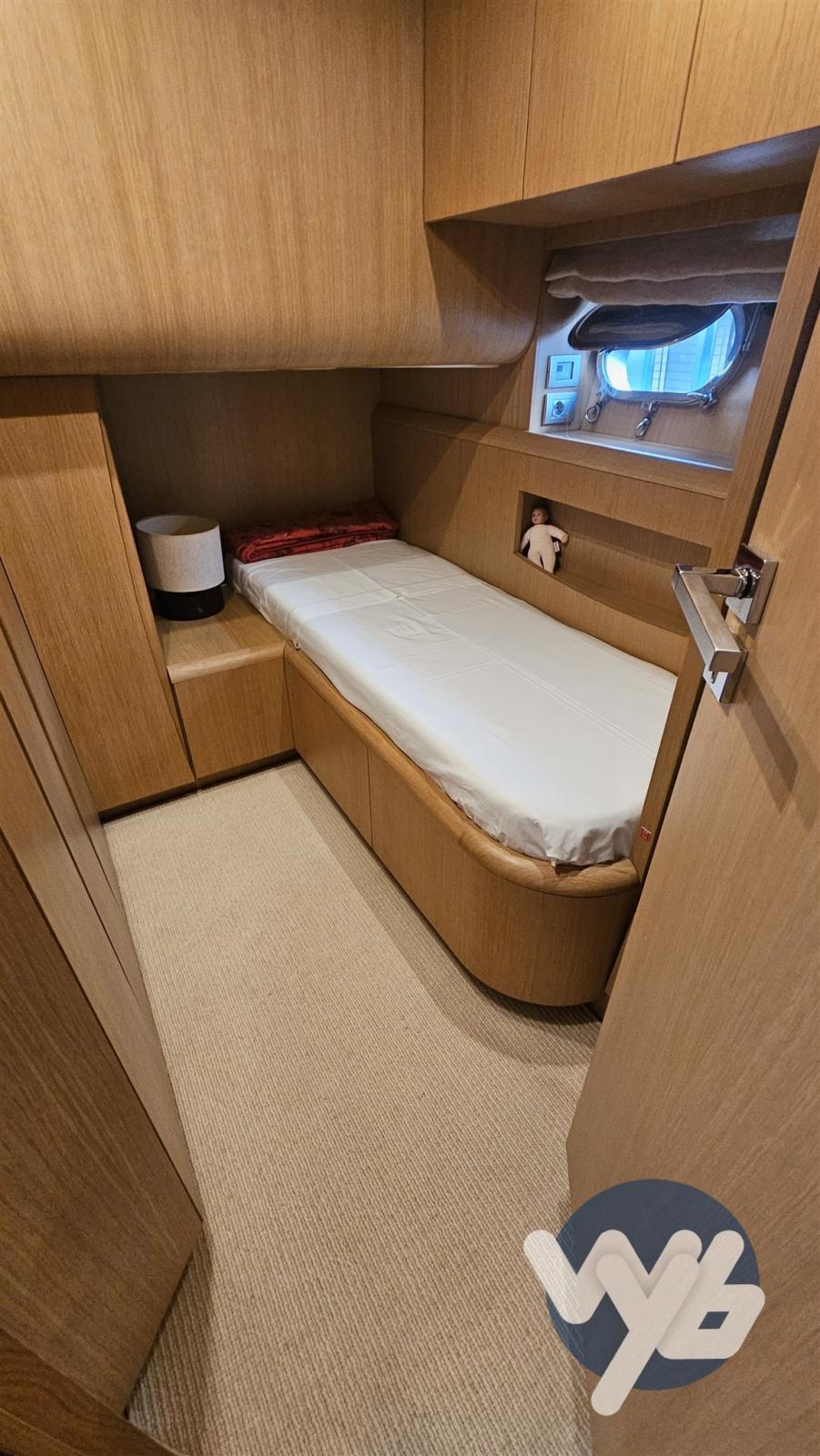 Finiture in legno chiaro. Cabina armatoriale a prua con bagno padronale e doccia separata.