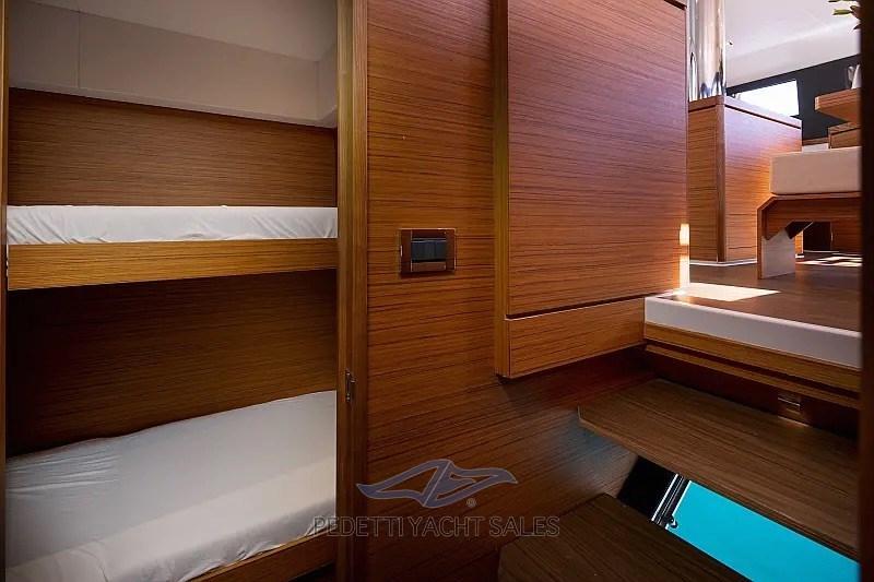 La dinette, modulabile in 3 posizioni – tavolo basso – tavolo da pranzo – doppio letto – con i sedili riposti in modo intelligente nei mobili centrali per mantenere un spazio più pulito. L’ampia finestra a 360 ° fronte mare garantisce luce e aerazione. I gavoni sono vari e ben pensati, con cassetti, per inserire ogni necessità.