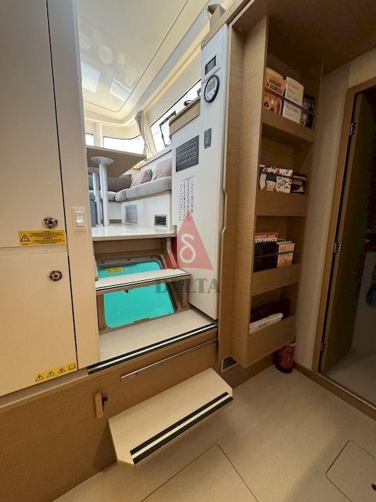Cucina (doppio lavello con pompa a pedale acqua mare), 2 Frigorifero interno (Isoterm 130CT 12-24V da 130 Lt. - Isoterm CR90F CT da 90 Lt), Lavastoviglie (Bosh Silence Plus), Lavatrice (Daewoo da 3 Kg), Microonde (Whirpool MWD121), 2 Piastra in vetroceramica (Bosh).
