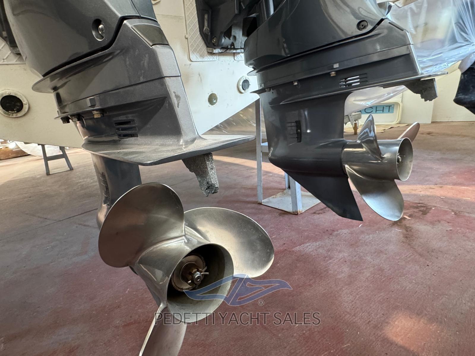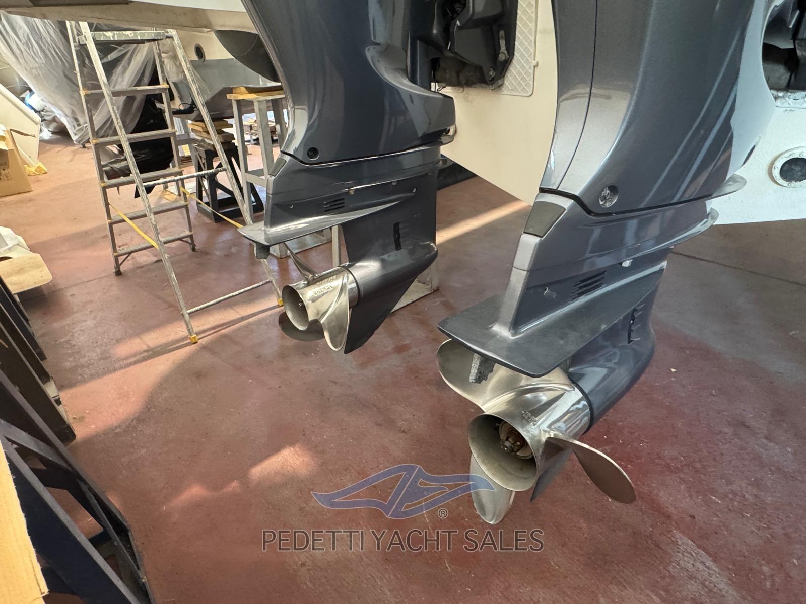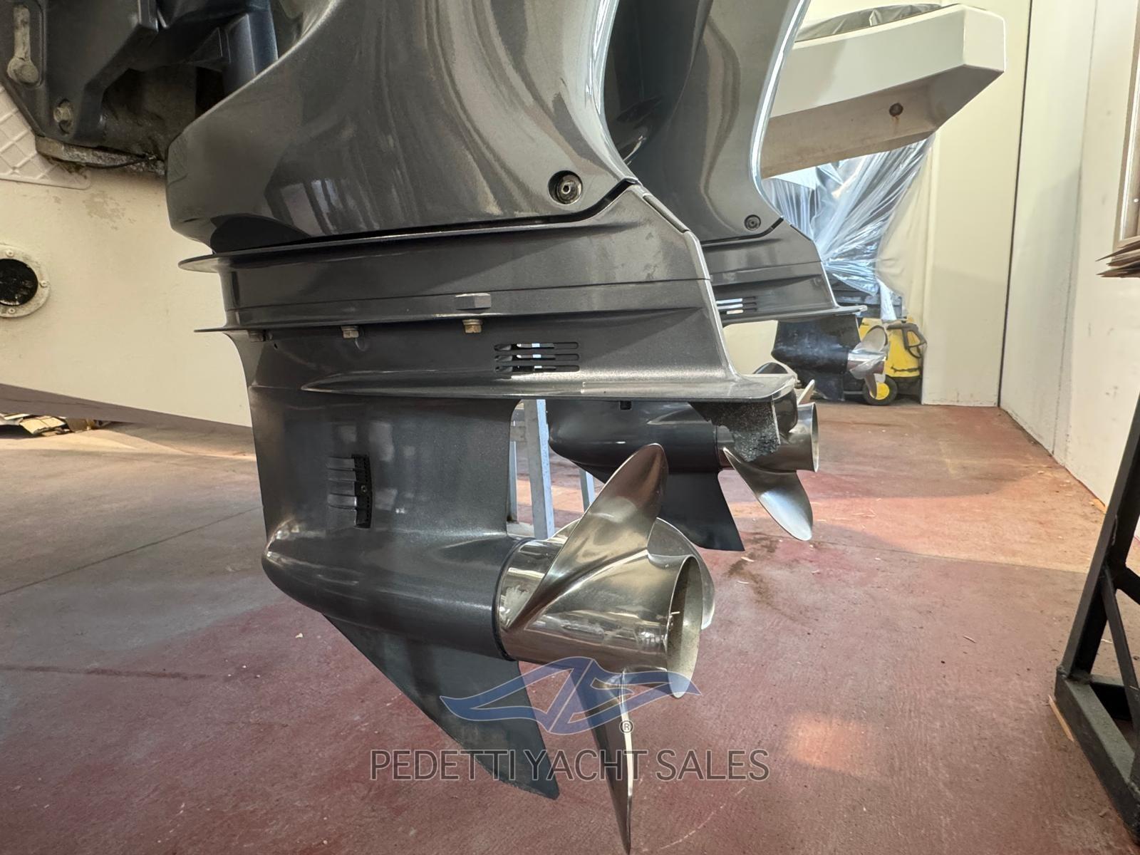 Allestimento full optional, con tubolari grigio, pulpito di prua in acciaio inox, manette elettroniche ed elettronica di bordo Garmin, completata da impianto stereo Fusion.