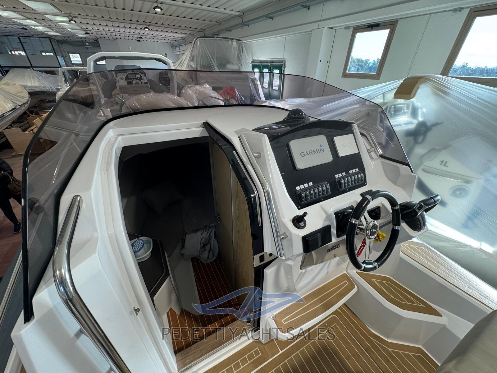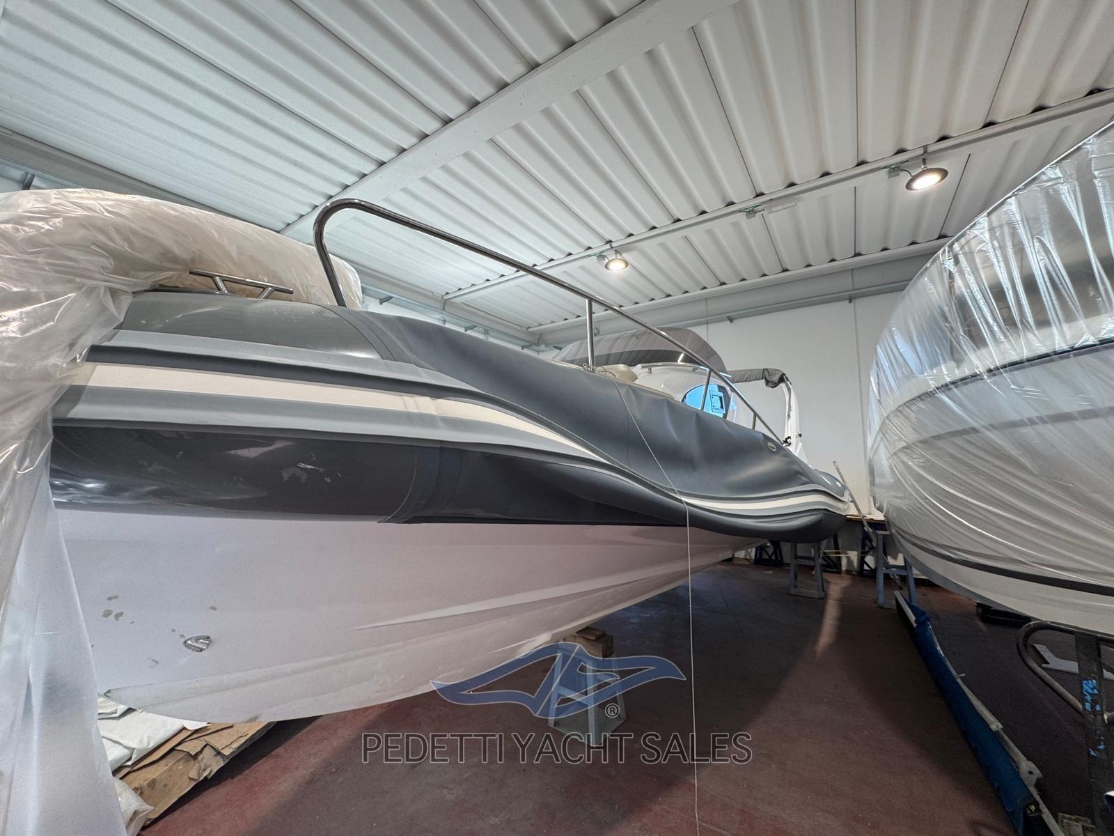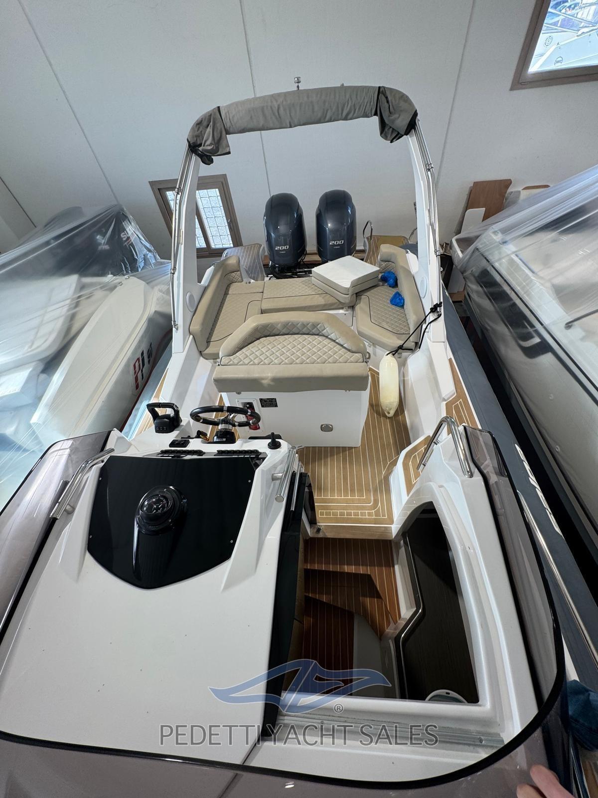 Allestimento full optional, con tubolari grigio, pulpito di prua in acciaio inox, manette elettroniche ed elettronica di bordo Garmin, completata da impianto stereo Fusion.