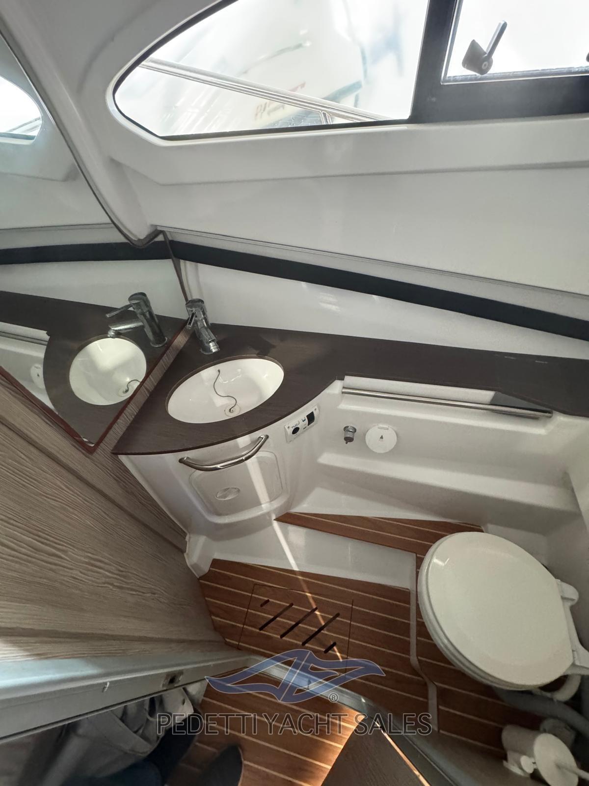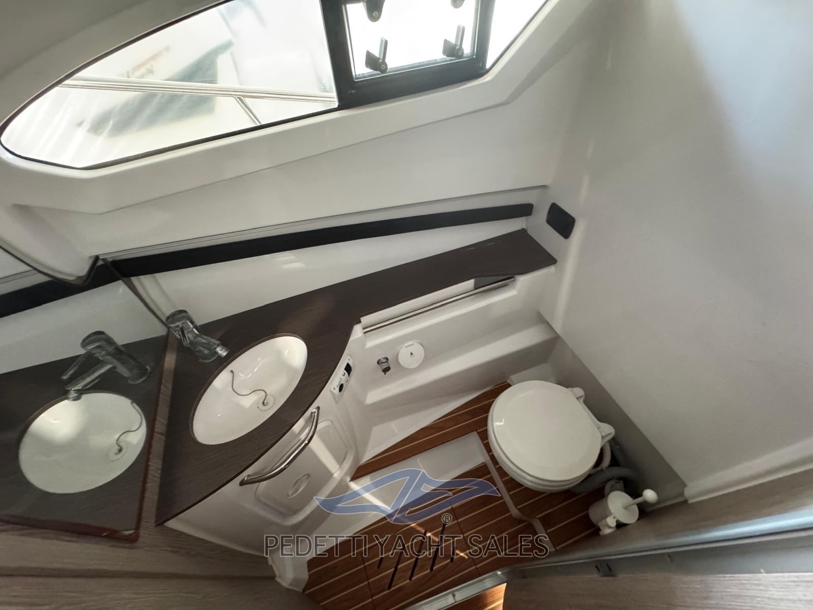 Cabin with separate bathroom equipped with an electric toilet. The boat also features a fiberglass rollbar with telescopic stainless steel bimini, bow thruster, flush-mounted cleats, stern platforms, and LED lighting.